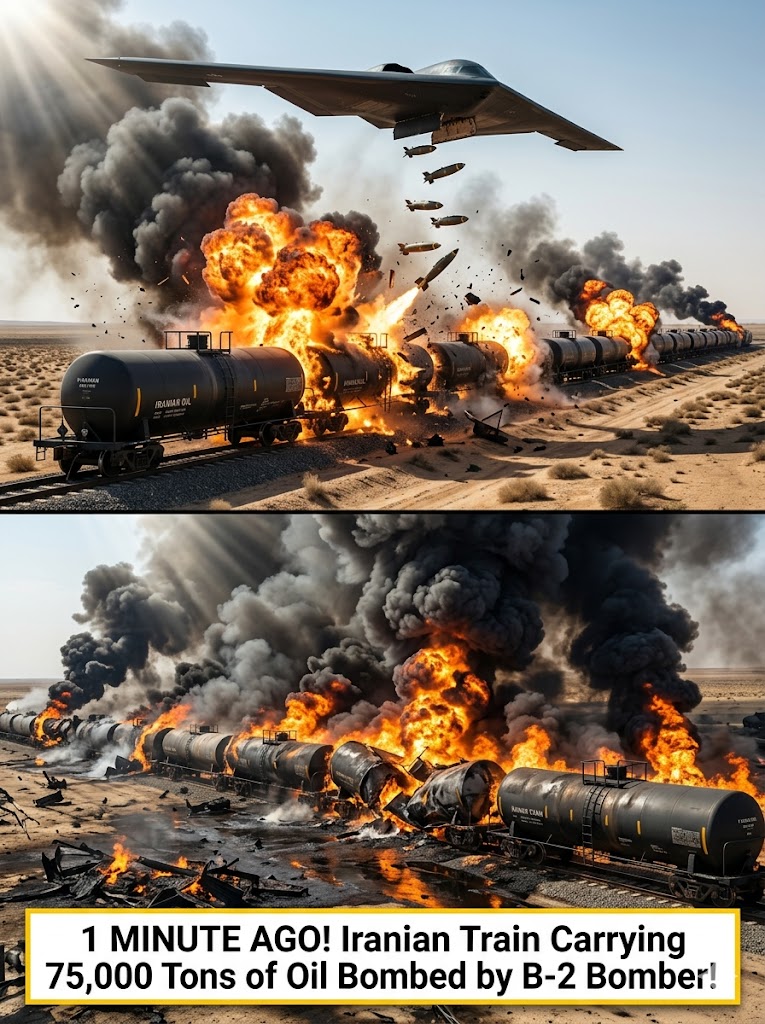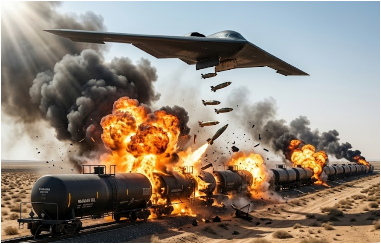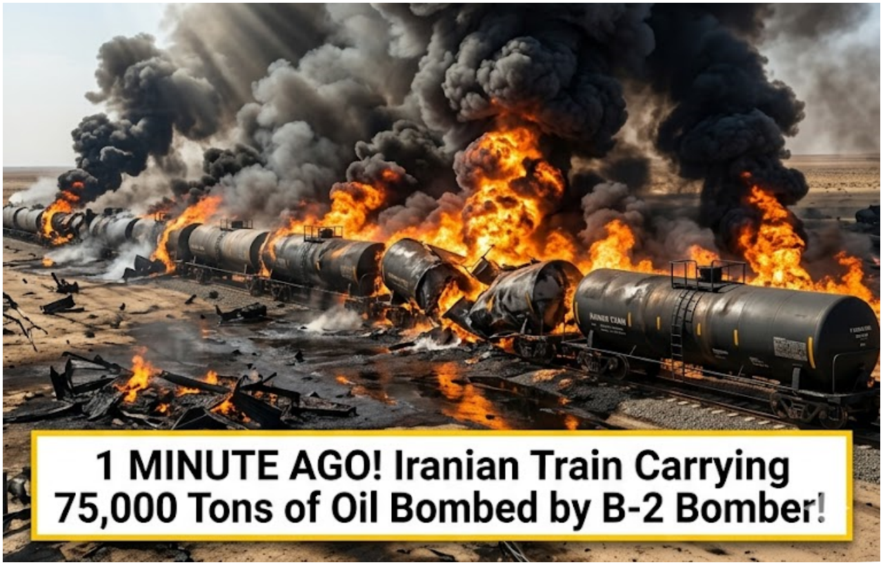 The B-2, flying undetected at high alтιтude, delivered multiple bunker-busting munitions directly onto the target. The train, which represented a desperate attempt by the Iranian regime to move oil by rail after the U.S. naval blockade crippled sea exports, was instantly turned into a raging inferno. U.S. officials confirm the entire shipment — worth hundreds of millions of dollars — has been completely destroyed.