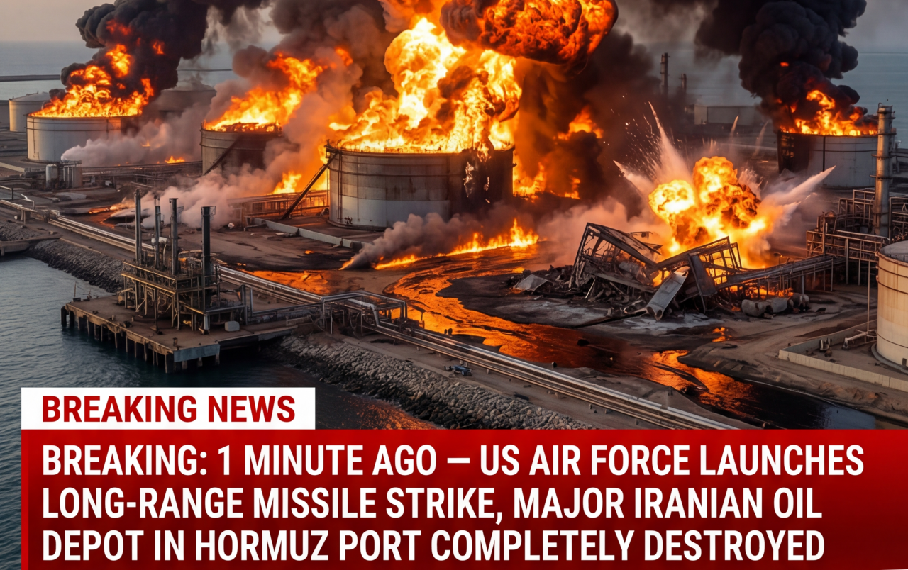 In a devastating precision strike that occurred just one minute ago, the US Air Force has obliterated a critical Iranian oil depot at the heart of the Hormuz Port. A powerful long-range missile slammed into the heavily guarded facility, triggering a mᴀssive fireball and a chain of thunderous secondary explosions that lit up the night sky over the Strait of Hormuz.