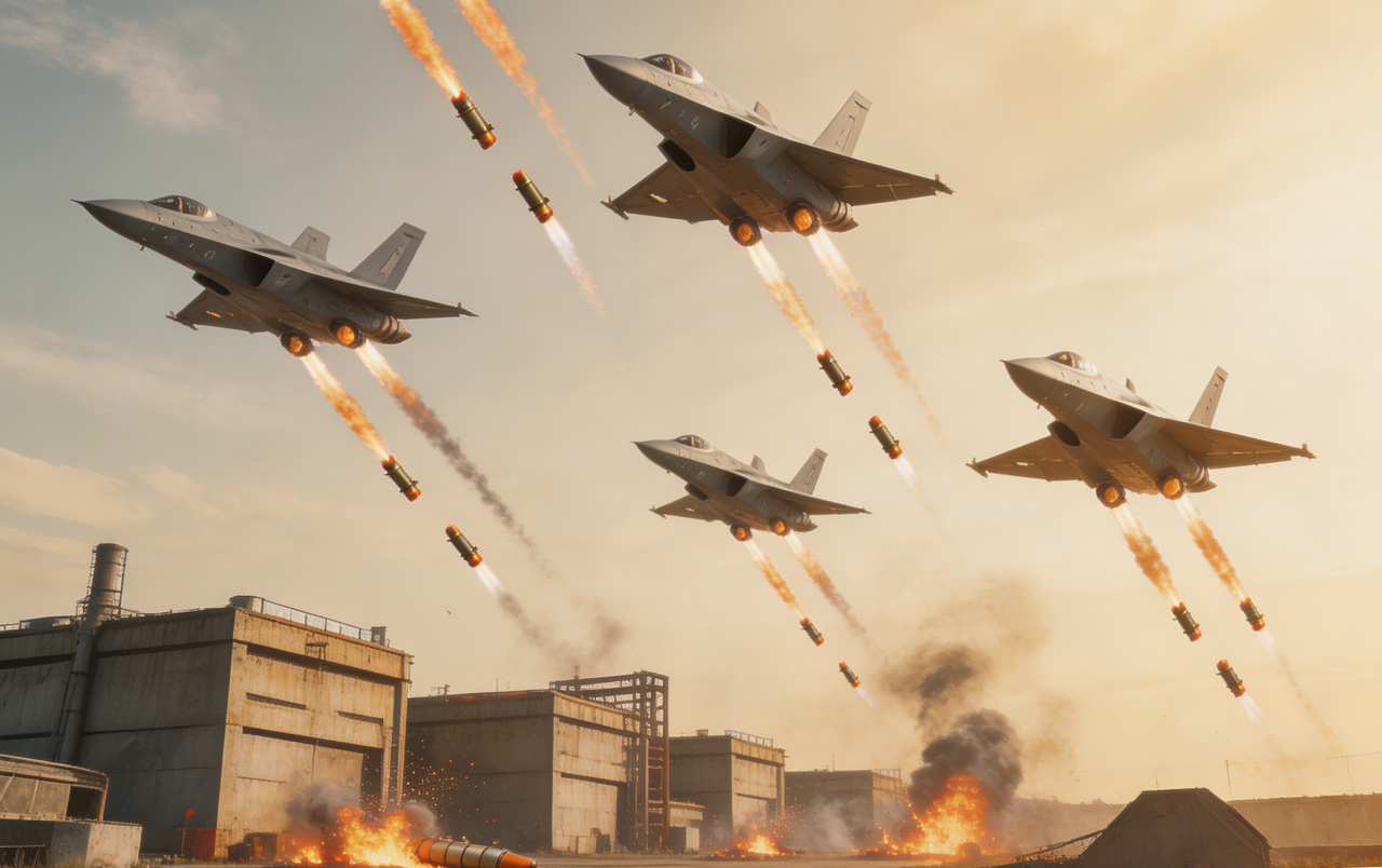 The advanced fifth-generation fighters penetrated Iranian airspace undetected and delivered a devastating payload of precision-guided bombs directly onto the heavily fortified underground and surface storage complex. The attack triggered a chain of catastrophic secondary explosions as thousands of missiles, artillery shells, and warheads cooked off, lighting up the sky and sending towering plumes of smoke and fire into the air.