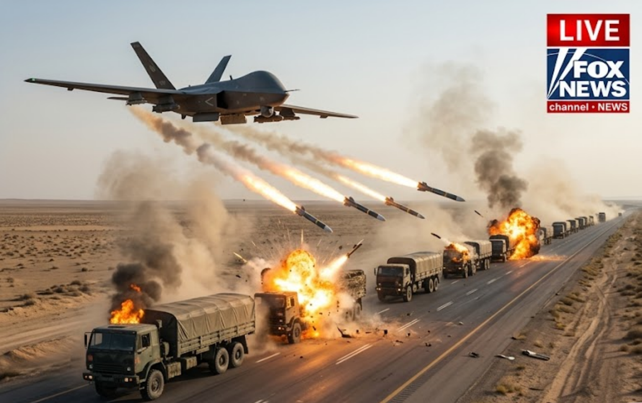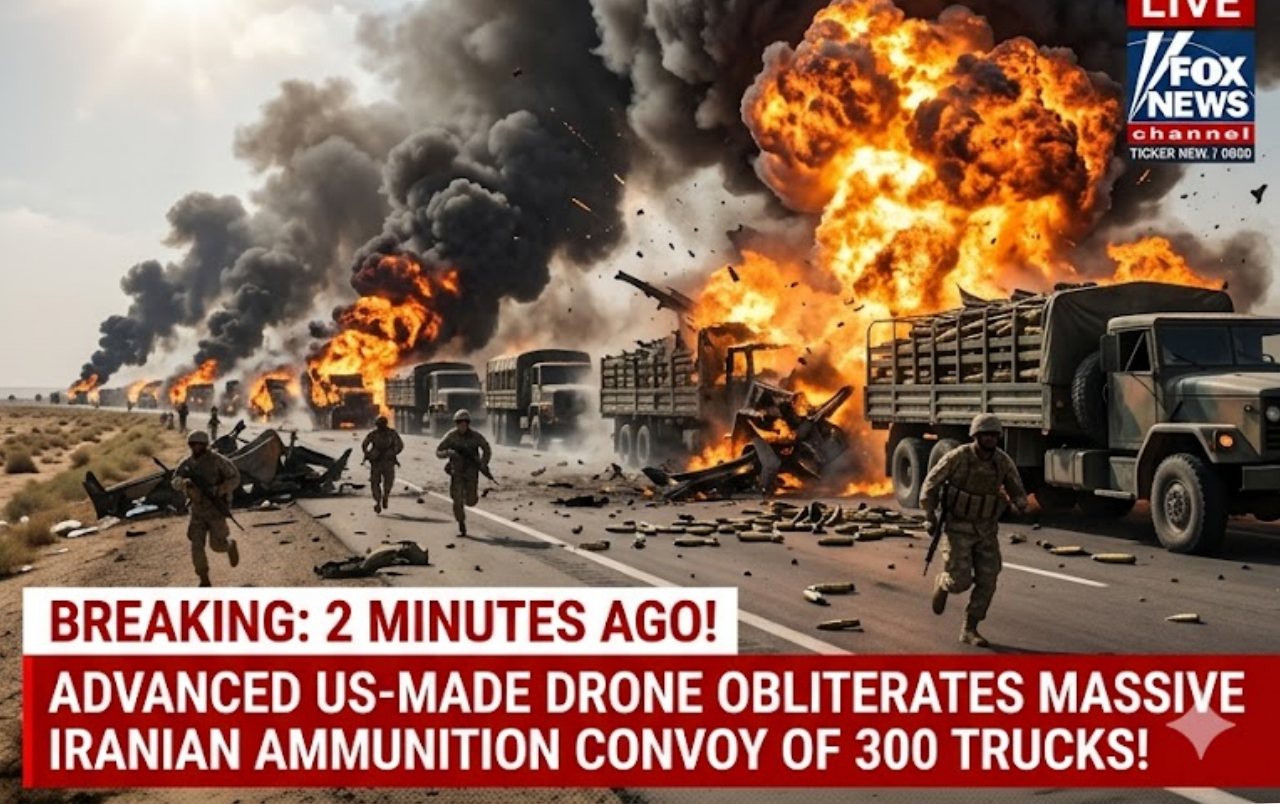 In a spectacular display of American technological superiority, a U.S.-made advanced drone has completely destroyed a convoy of 300 Iranian ammunition trucks in a devastating precision strike just minutes ago.