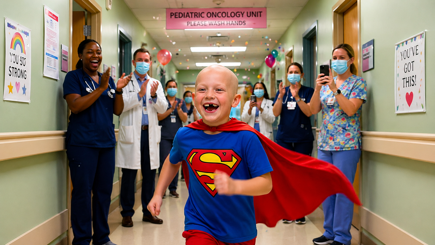 Instead of only celebrating his own victory, Brett thought about them. He spoke about his friends, the ones who had shared that journey with him, and said he wanted them to have their moment too. He wanted them to feel strong again, to wear their Superman capes, and to run out those doors just like he did. That kind of selfless hope, especially from someone so young, is what makes his story even more powerful. It’s not just about survival; it’s about believing that others will make it too.