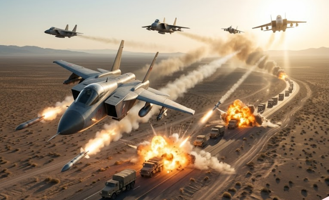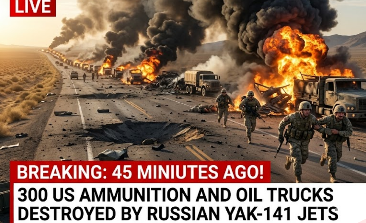 In a brazen and highly escalatory attack that occurred just 45 minutes ago, Russian Yak-141 jets launched a surprise ᴀssault on a major U.S. logistics convoy, destroying approximately 300 trucks loaded with ammunition and critical oil supplies. The strike targeted a key supply route in a high-tension zone, sending mᴀssive fireballs into the sky and creating thick columns of black smoke visible for miles.