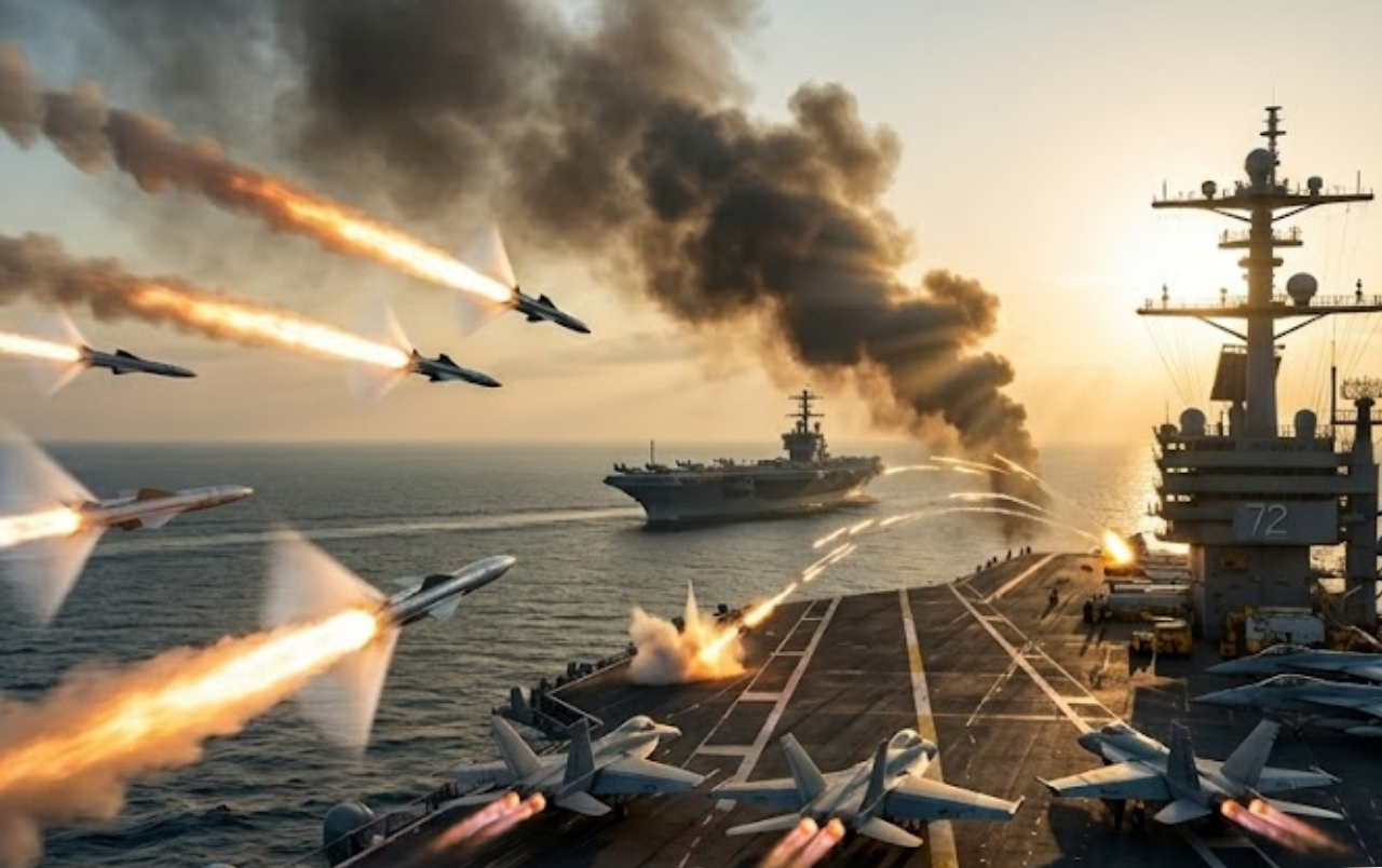 U.S. Navy Aegis destroyers responded instantly, launching a barrage of SM-3 and SM-6 interceptors. The sky lit up with streaks of fire as the defensive missiles roared upward. Electronic warfare aircraft jammed the incoming threats while the carrier itself deployed decoys and activated its Close-In Weapon Systems.