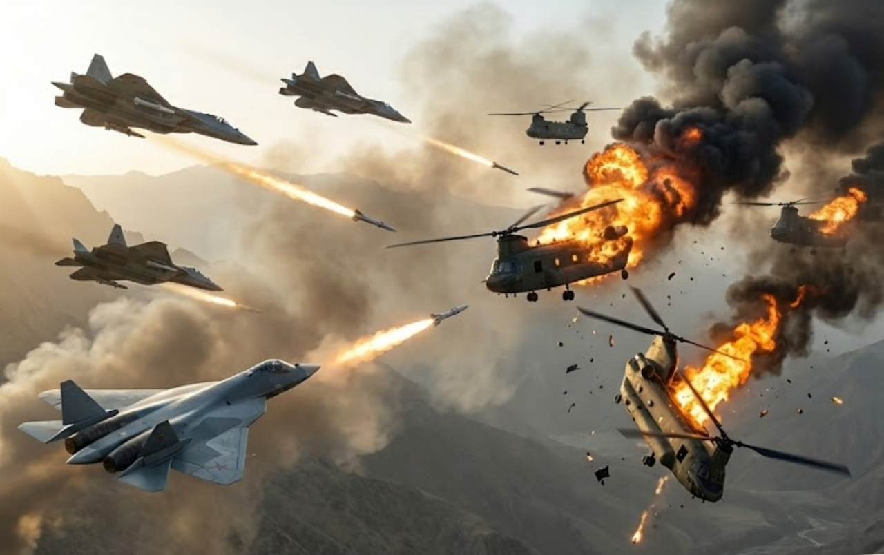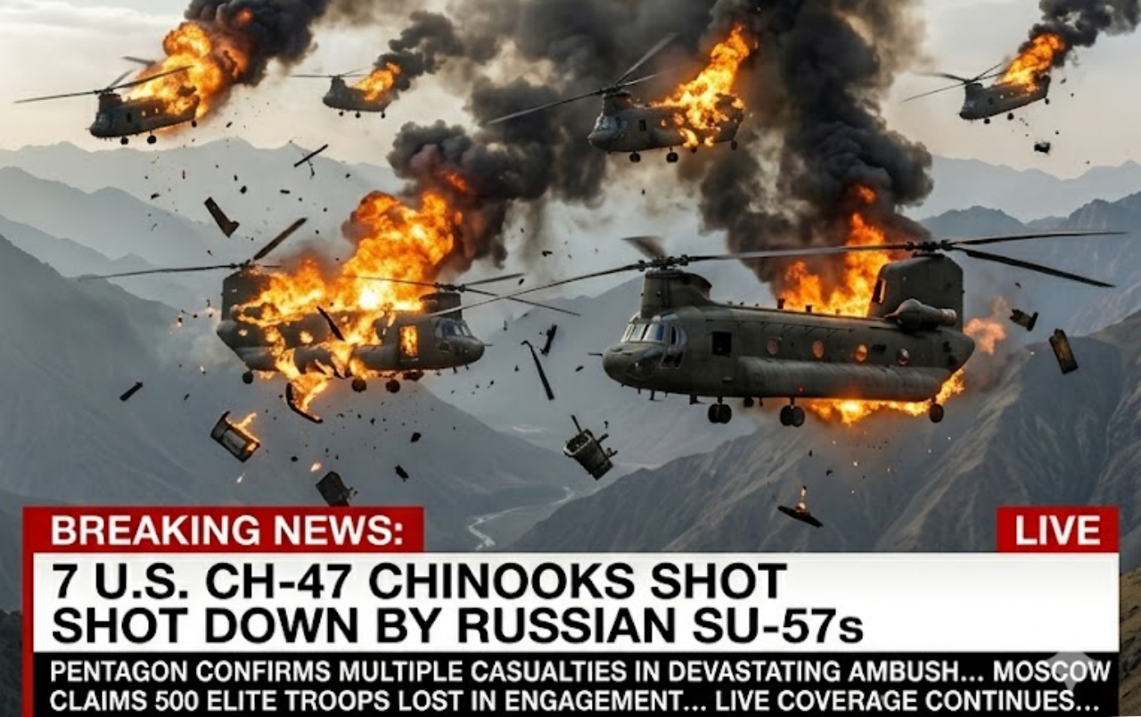In a devastating ambush, seven US Army CH-47 Chinook helicopters transporting approximately 500 elite American troops have been sH๏τ down by Russian Su-57 stealth fighters. The helicopters were reportedly en route to a critical mission when they came under sudden attack from advanced Russian aircraft, resulting in heavy losses.