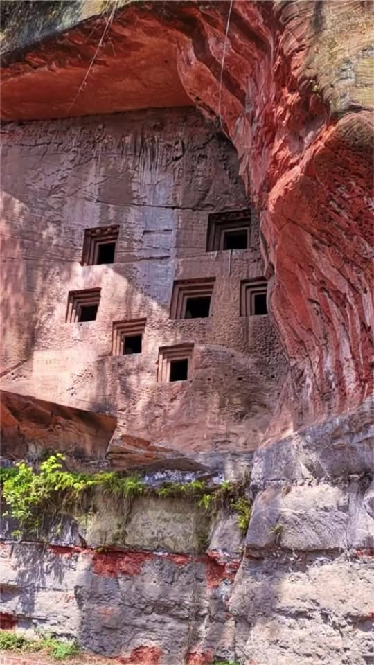 High upon a red sandstone cliff, where wind carves the air into whispers and time itself seems to hesitate, stand a series of perfectly squared windows cut into stone — silent, symmetrical, and impossibly precise. No one knows who made them. No one knows why. But when the sunlight slides across the openings, casting golden lines into the dark hollows, it feels as if the rock itself remembers.