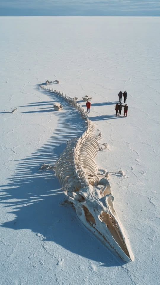 They first saw it from the horizon — a long, pale arc cutting through the white emptiness like a scar across the skin of the Earth. At first, they thought it was a mirage, a trick of the light born from exhaustion and the blazing glare of the salt flats. But as they drew closer, the shape resolved into something impossibly vast and ancient — the bleached skeleton of a creature that had once ruled an ocean now turned to desert.