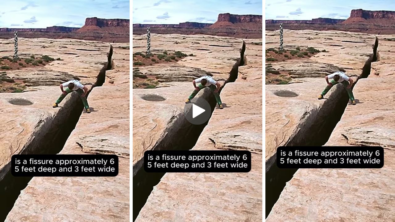 A man crouches at its edge, his arms braced across the opening as if attempting to bridge what nature has divided. His shadow spills into the darkness below, where sunlight fails to reach. The crack — roughly six and a half feet deep and three feet wide — is not just a wound in the landscape, but a reminder of the planet’s restless heart.