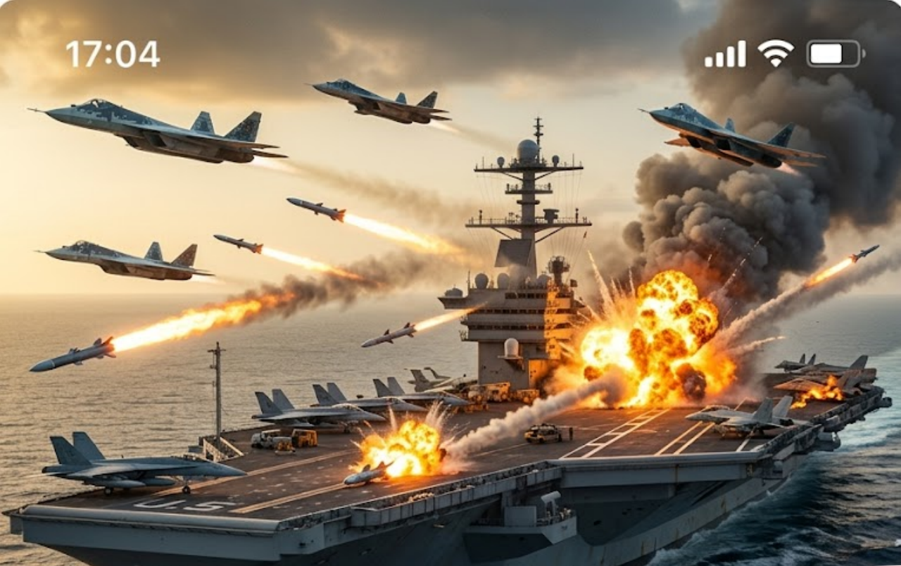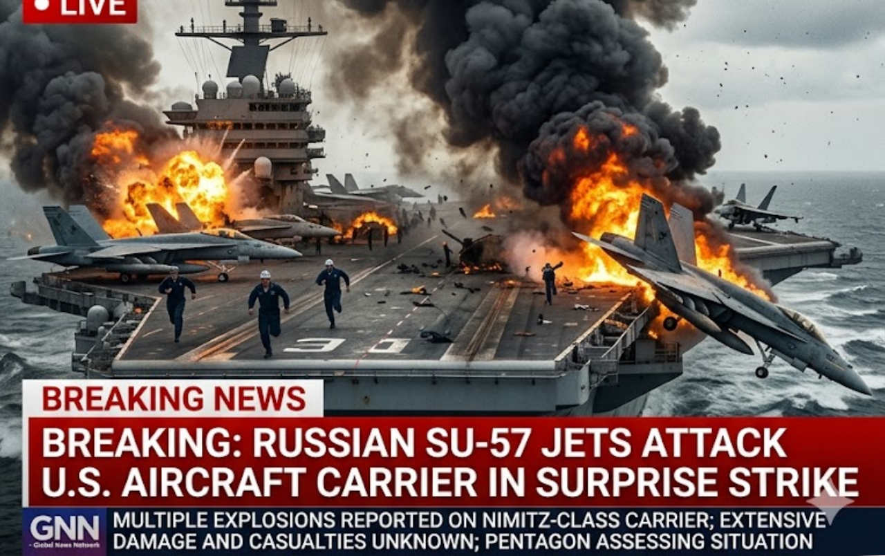 In a shocking and dangerous escalation of the ongoing Middle East conflict, Russian Su-57 stealth fighter jets conducted a direct attack on a US Navy aircraft carrier operating in the Persian Gulf region. The carrier, loaded with critical weapons, ammunition, and aircraft supporting operations in the Strait of Hormuz, came under fire from a flight of advanced Russian jets believed to be operating in support of the collapsing Iranian regime.