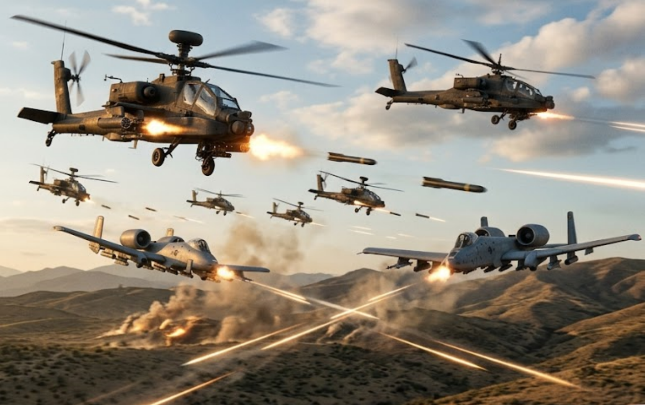 In a display of overwhelming American air power, U.S. Army AH-64 Apache attack helicopters and A-10 Warthog ground-attack aircraft have seized complete air supremacy over key regions of Iran. Operating in devastating hunter-killer teams, the feared Apaches and heavily armored Warthogs have unleashed relentless strikes on Iranian air defenses, missile sites, radar installations, and remaining IRGC ground forces.