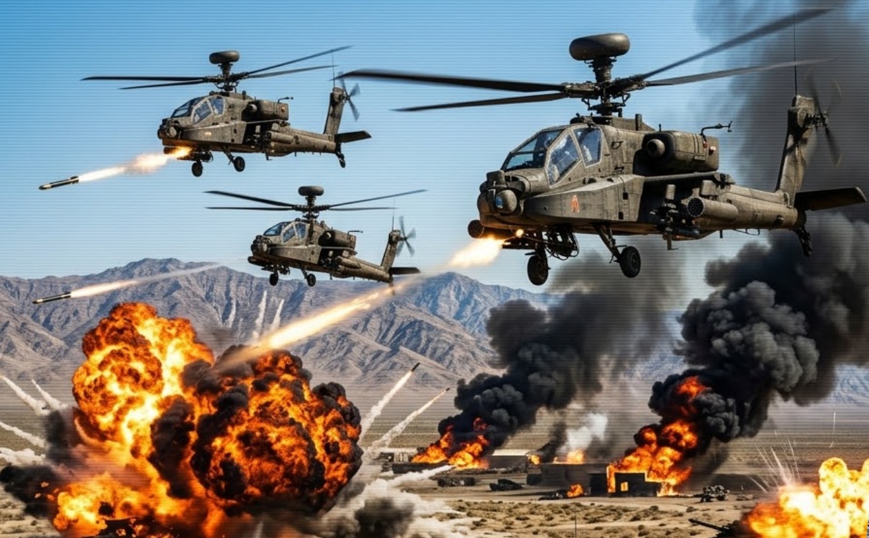 In a ferocious display of American airpower, waves of U.S. Army AH-64 Apache attack helicopters have unleashed devastating strikes on Iranian positions along the Strait of Hormuz and southern coastal defenses. Operating at low alтιтude with lethal precision, the Apaches rained Hellfire missiles and 30mm chain-gun fire on Iranian fast-attack boats, drone launch sites, and radar installations, creating scenes of absolute chaos that Iranian forces described as “Armageddon.”