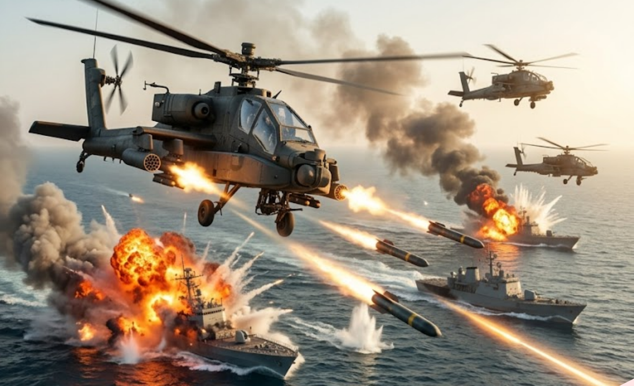 In a powerful display of American air dominance, U.S. Army AH-64 Apache attack helicopters have launched a devastating game-changing strike that has effectively secured the Strait of Hormuz for international shipping. Operating in coordinated waves with naval support, the elite Apache squadrons destroyed dozens of Iranian anti-ship missile batteries, coastal radar sites, and IRGC fast-attack boats attempting to threaten commercial vessels.