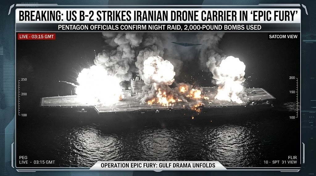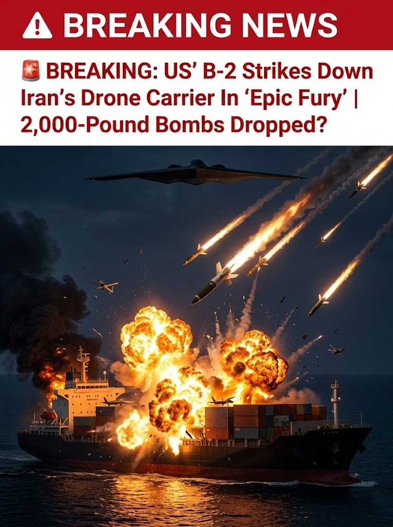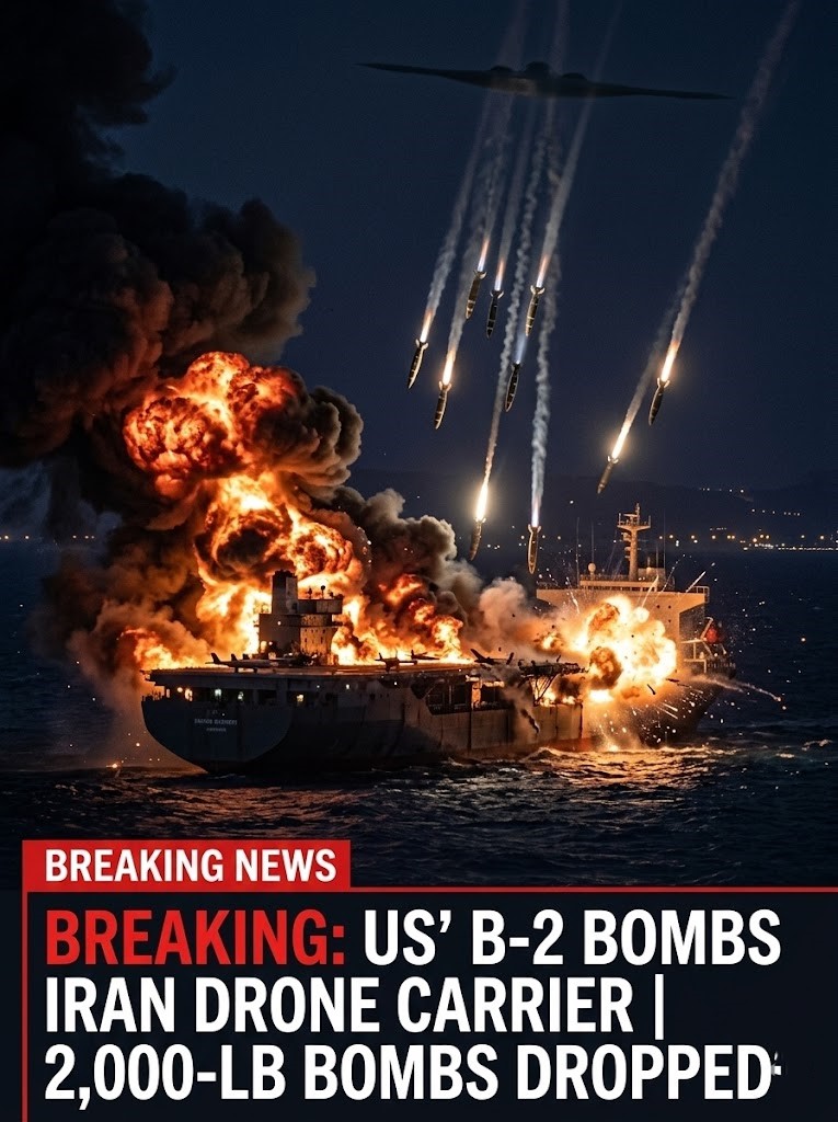 In a surgical night raid that has decimated Iran’s maritime drone capabilities, a U.S. B-2 Spirit stealth bomber successfully targeted and crippled the Shahid Bagheri, the Islamic Republic’s flagship drone carrier. As part of the ongoing Operation Epic Fury, the Pentagon confirmed the use of heavy 2,000-pound precision-guided munitions to neutralize the converted container ship deep within the Persian Gulf.