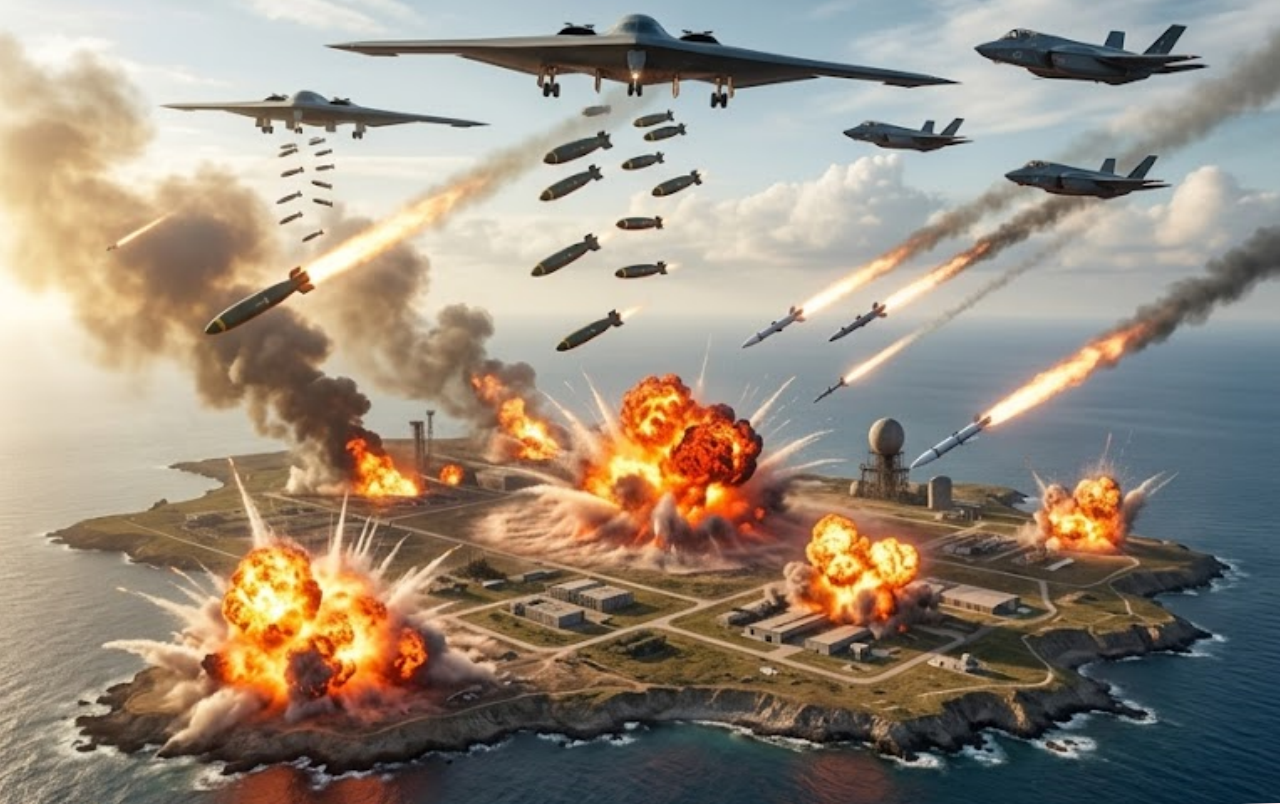 Waves of advanced US aircraft, including B-2 Spirit stealth bombers and F-35 Lightning II fighters, struck the island with overwhelming force. Heavy bunker-busting munitions and precision-guided missiles slammed into hardened underground command centers, missile storage facilities, anti-aircraft batteries, and naval support bases. The entire military complex is now in flames, with thick black smoke rising high into the sky as secondary explosions continue to rip through what was left of Iran’s last major foothold in the region.