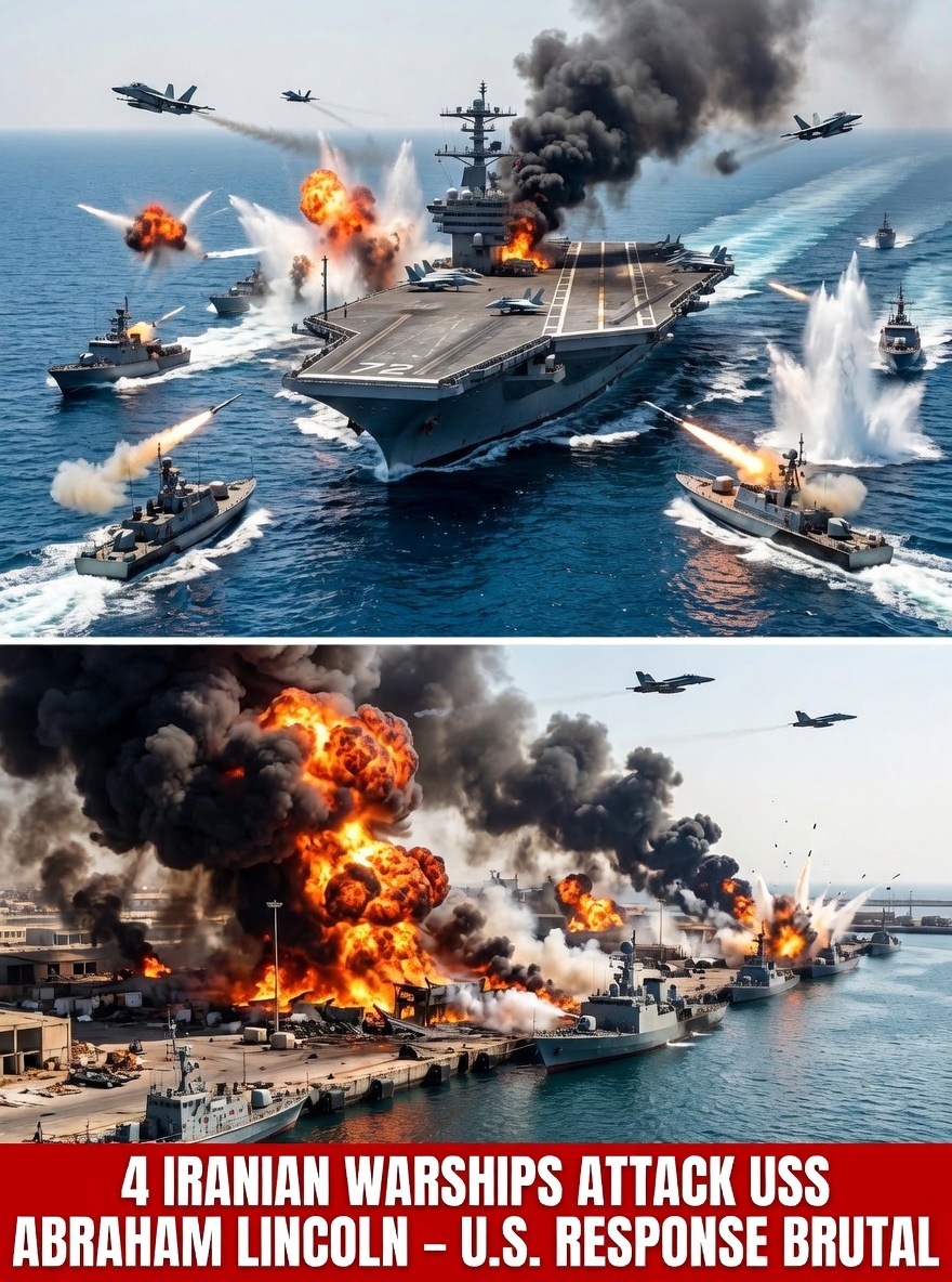 This video covers a coordinated naval attack when four Iranian warships attempted to surround and overwhelm USS Abraham Lincoln aircraft carrier in the Persian Gulf. The Iranian task force fired thirty-two anti-ship missiles and sixteen torpedoes in a multi-directional ᴀssault. The American carrier group successfully defended against all threats, then F/A-18 fighters destroyed six additional Iranian warships at Bandar Abbas naval base.