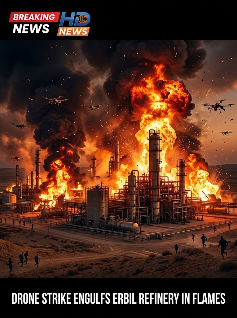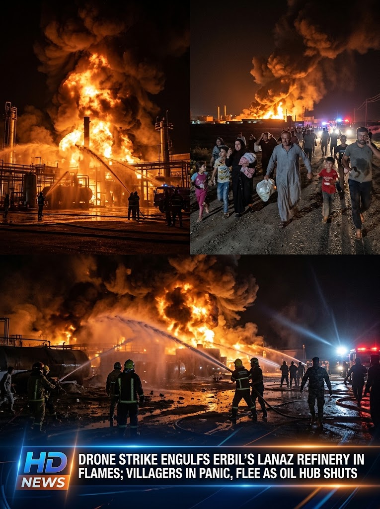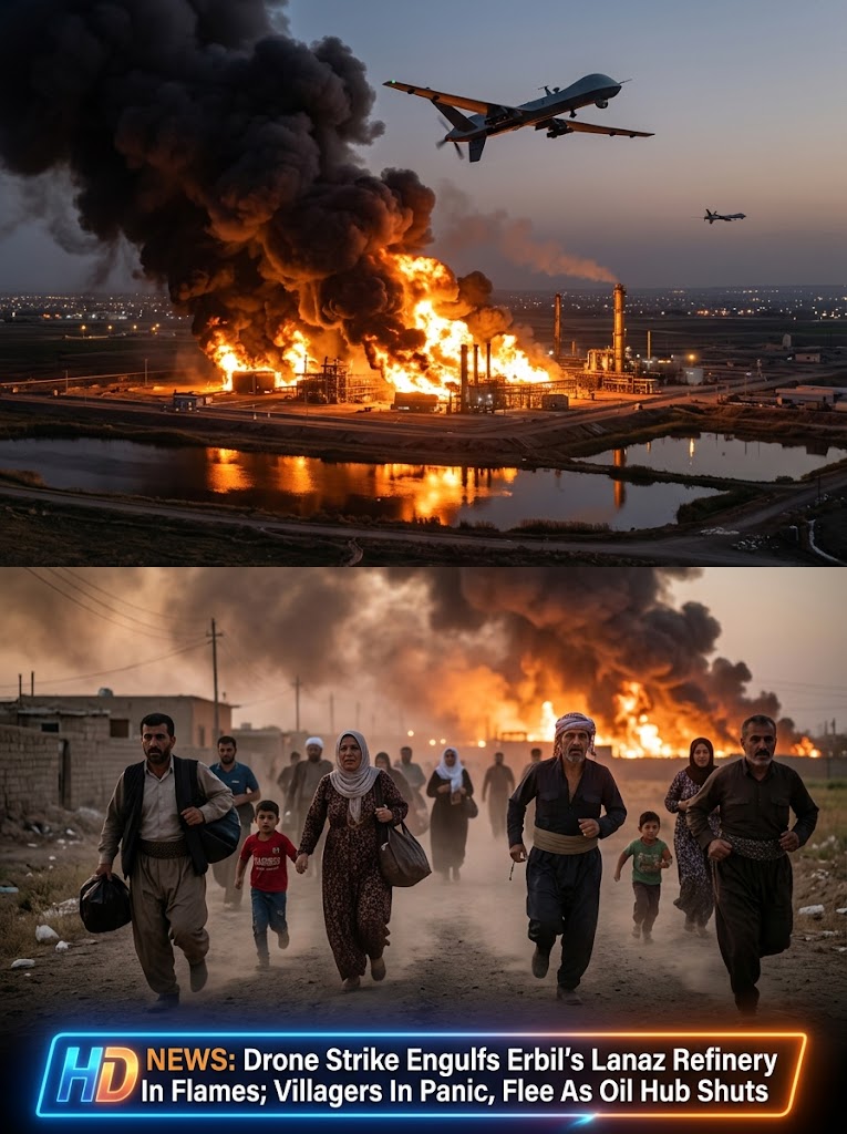 A major fire has erupted at an oil facility near Erbil after a drone strike hit the Lanaz Refinery, sending thick smoke and flames into the sky and forcing nearby residents to flee the area in panic.