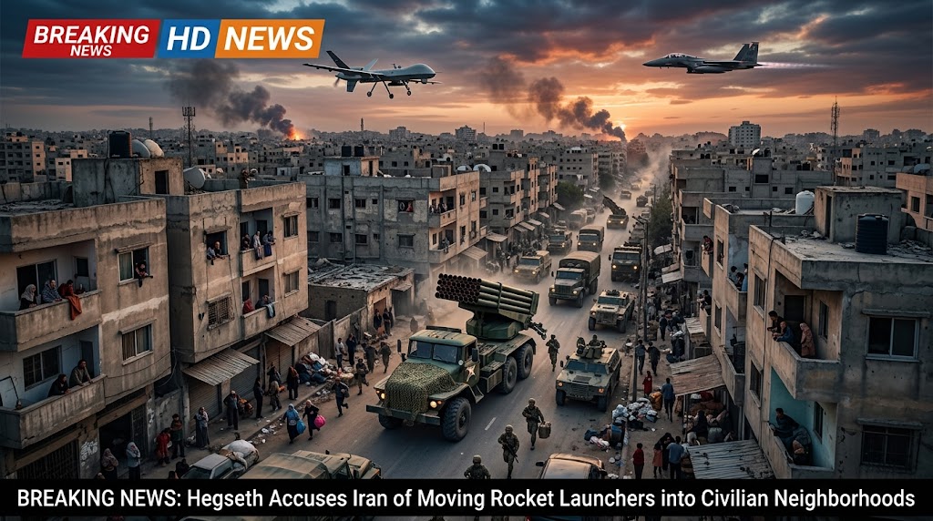 Speaking during a Pentagon briefing, Hegseth stated that Iranian forces are “moving rocket launchers into civilian neighborhoods, near schools, near hospitals” in an effort to complicate U.S. targeting and deter strikes.