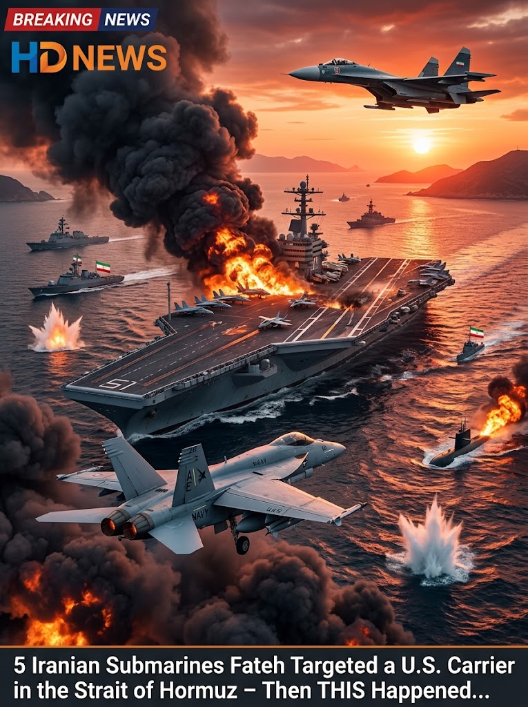 Good evening. A dramatic naval scenario circulating in military discussions and online reports claims that multiple Iranian submarines attempted to track and target a U.S. aircraft carrier operating near the Strait of Hormuz, one of the world’s most sensitive maritime chokepoints.