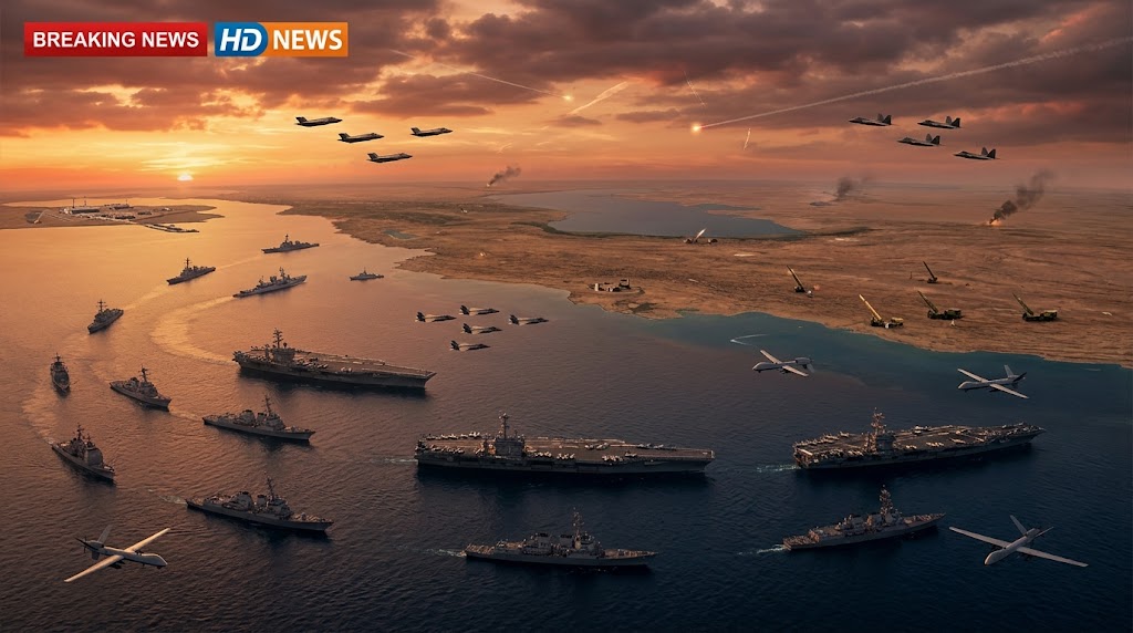 U.S. Navy carrier strike groups and surface warships are patrolling strategic waters, especially in the Strait of Hormuz and the northern Arabian Sea, creating a maritime cordon designed to deter further escalation and secure critical sea lanes. These forces support missile defense, air patrols, and interception capabilities around Iranian territory.