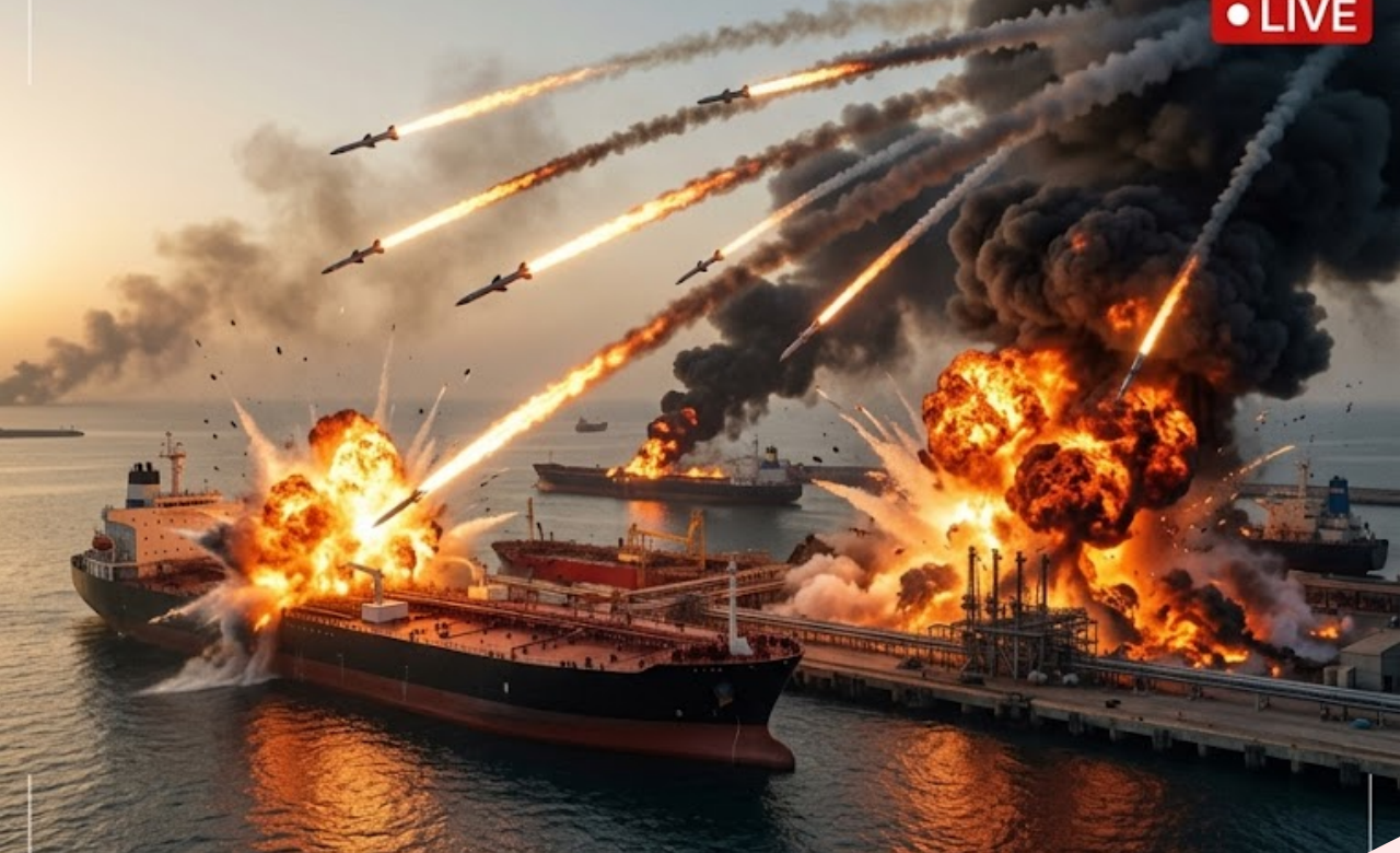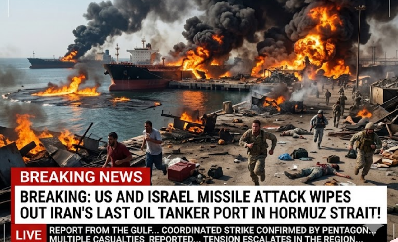 In a crushing display of precision firepower, American and Israeli forces have completely destroyed Iran’s final operational oil tanker port in the Strait of Hormuz. Waves of advanced cruise missiles slammed into the heavily defended facility at Bandar Abbas, reducing loading terminals, storage tanks, and docking infrastructure to rubble in a matter of minutes.
