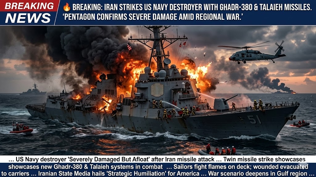 A dramatic escalation in the U.S.–Iran maritime confrontation has erupted after Iran’s Islamic Revolutionary Guard Corps (IRGC) claimed that its forces struck a U.S. Navy destroyer in the Indian Ocean, using its advanced Ghadr‑380 medium‑range ballistic missiles alongside Talaieh strategic cruise missiles. The event is being described by Tehran as a major strategic humiliation against U.S. forces, though independent confirmation remains limited.