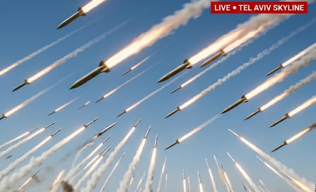 Air raid sirens wailed continuously for nearly an hour as dozens of Iranian missiles streaked toward the densely populated heart of Israel. Explosions echoed through Tel Aviv’s skyline, with confirmed impacts causing structural damage to buildings and sparking multiple fires. In Holon, two civilians were injured by shrapnel and flying debris after a missile fragment struck a residential area.