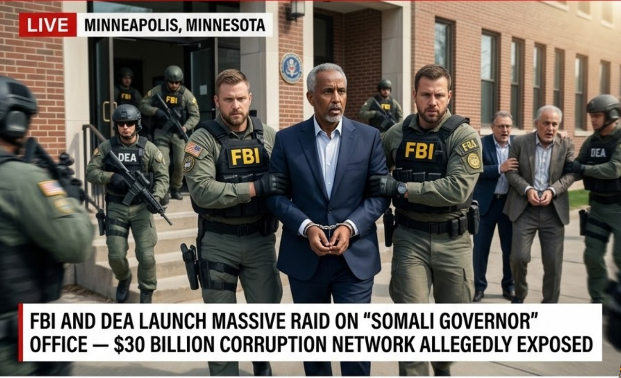 Minneapolis, Minnesota – In a stunning operation that has rocked Minnesota’s political world, the FBI and DEA stormed the offices and properties linked to a powerful Somali-American political figure widely known as the “Somali Governor,” uncovering what investigators claim is a staggering $30 billion international corruption and money laundering network.