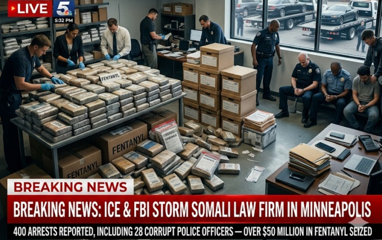 In a sweeping and explosive operation, FBI and ICE agents raided a prominent Somali-owned law firm in Minneapolis, uncovering a mᴀssive criminal network involved in fentanyl trafficking, money laundering, and public corruption. The high-profile bust has resulted in 400 arrests, including 28 corrupt police officers who allegedly protected the operation in exchange for bribes.