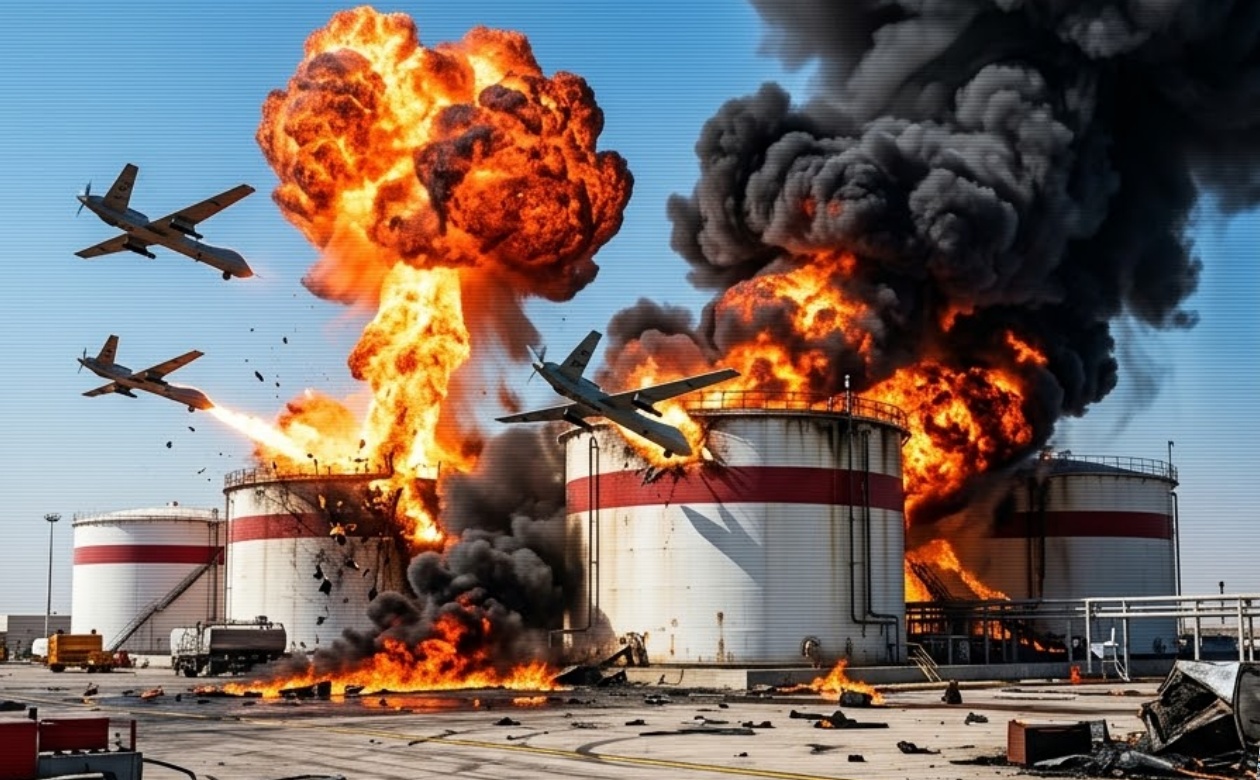 Multiple waves of advanced Iranian drones successfully penetrated Kuwaiti and U.S.-operated air defenses, including Patriot missile batteries, before slamming into the main fuel depot with devastating accuracy. The impact caused raging fires across several storage tanks, lighting up the night sky in a terrifying spectacle. Dramatic videos circulating online show bright flashes followed by thunderous blasts as emergency crews desperately battled the blaze under extreme heat.