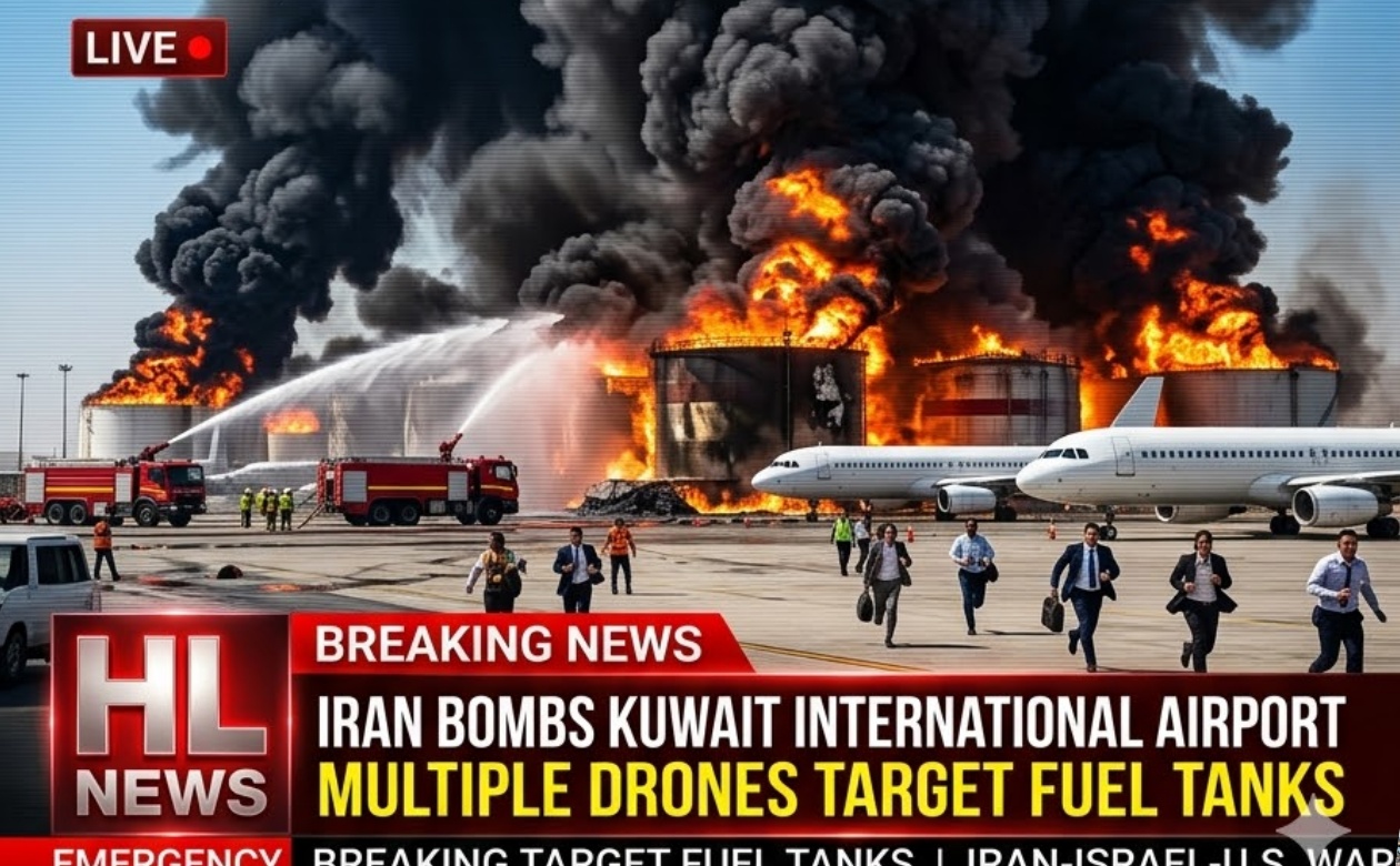 In a bold and precisely executed strike, Iranian drones have bombed Kuwait International Airport, directly hitting a major jet fuel storage tank and triggering a mᴀssive inferno that has engulfed parts of the facility. Thick black smoke billowed hundreds of feet into the sky as powerful secondary explosions rocked the airport, forcing the immediate suspension of all flights and plunging the key Gulf aviation hub into chaos.