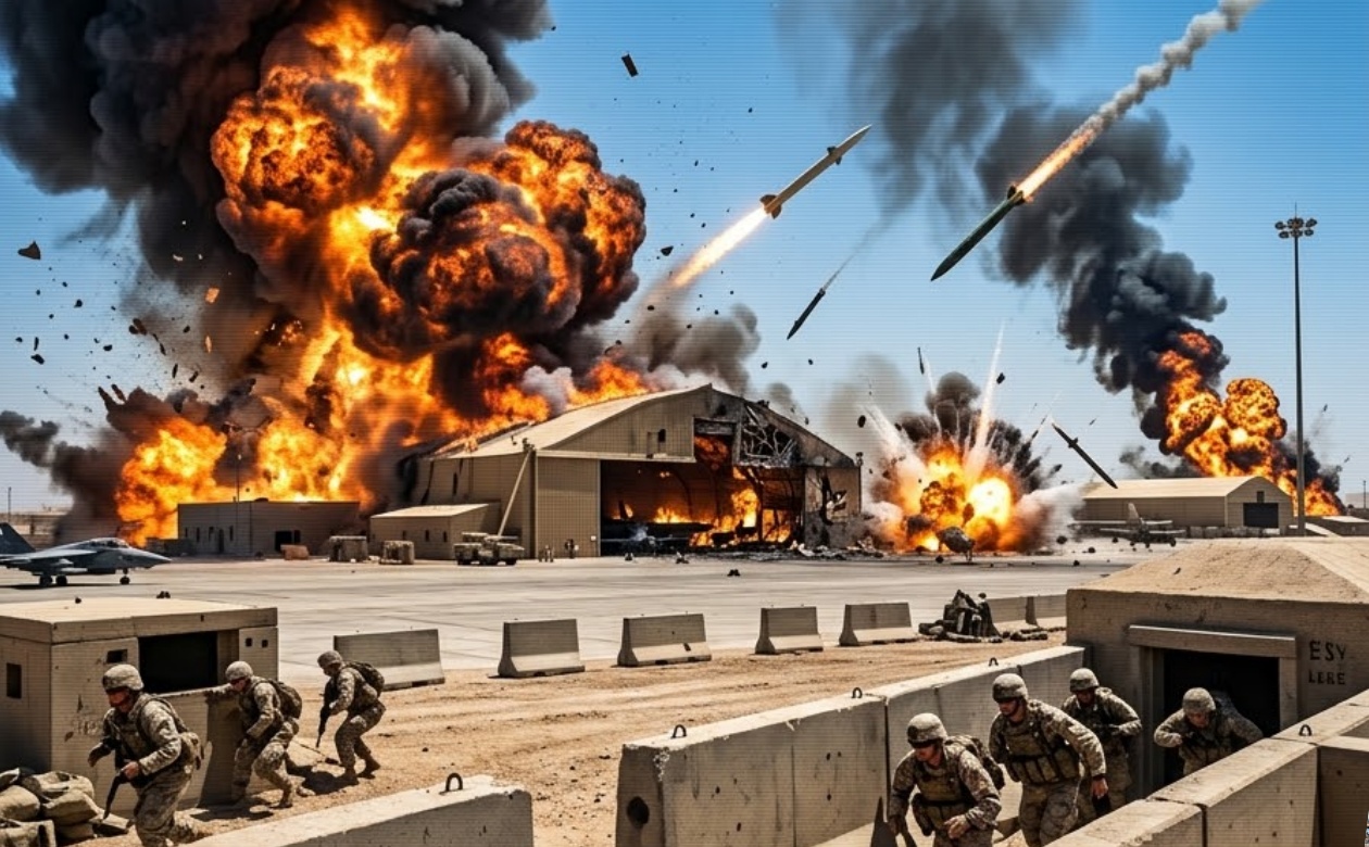 Multiple U.S. bases reported direct impacts and near-misses as Iranian drones successfully penetrated layered defenses, including Patriot missile batteries. Explosions rocked logistics hubs and aircraft parking areas, triggering secondary fires and forcing emergency evacuations. Videos circulating online show thick smoke rising over American facilities as troops scramble to move equipment and personnel to secondary locations. Pentagon sources confirm several bases have been partially evacuated, with troops repositioned deeper into the desert or onto ships — a clear sign of mounting pressure.