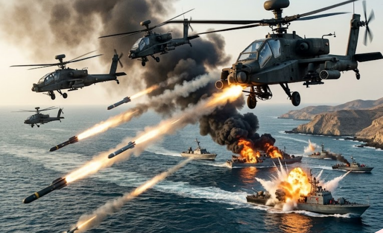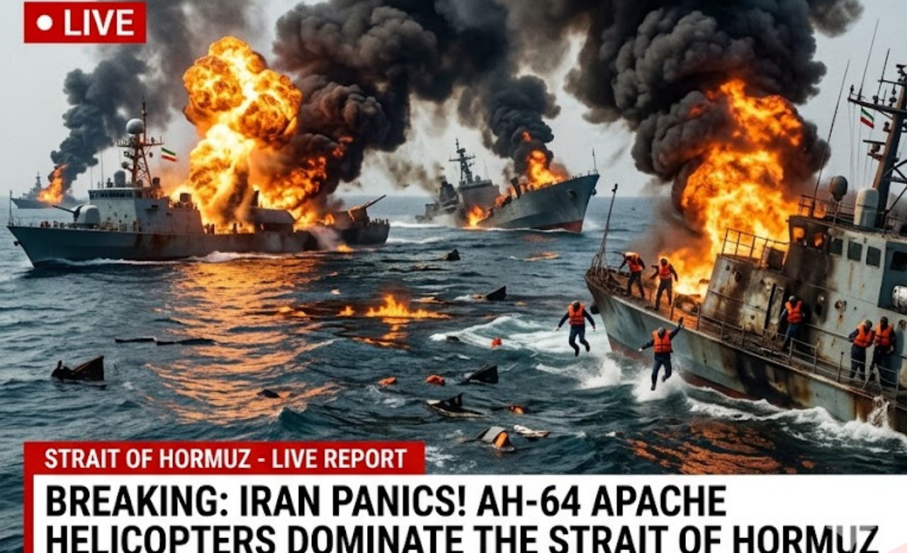 Strait of Hormuz – Iran’s naval forces are in complete disarray as U.S. Army AH-64 Apache attack helicopters have taken absolute control of the skies over the Strait of Hormuz, turning Iranian vessels into floating targets in a one-sided display of American airpower.