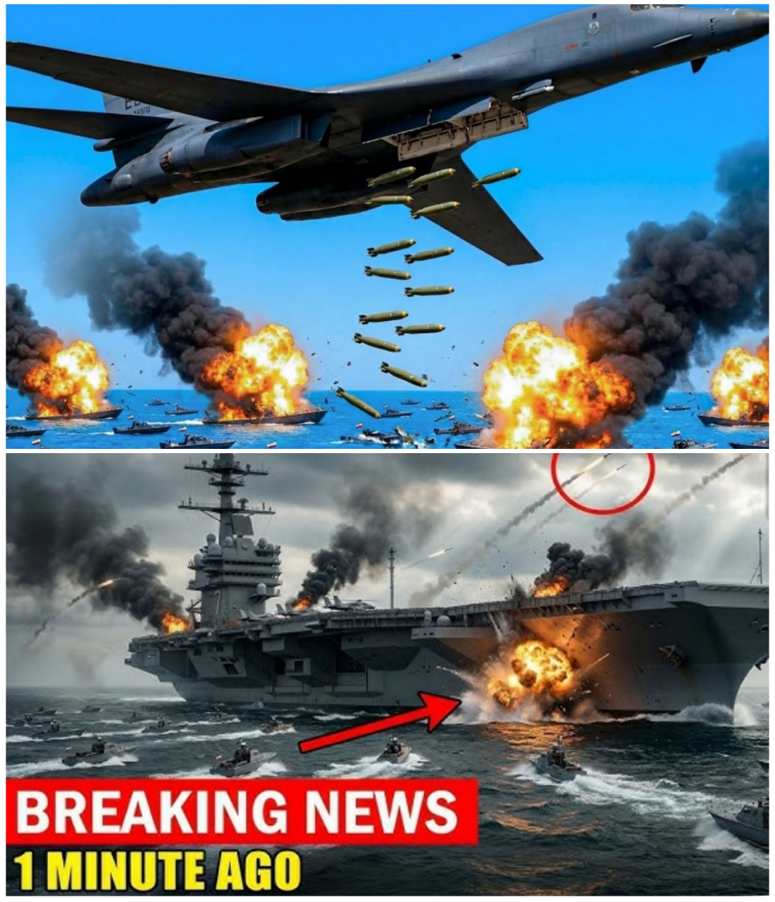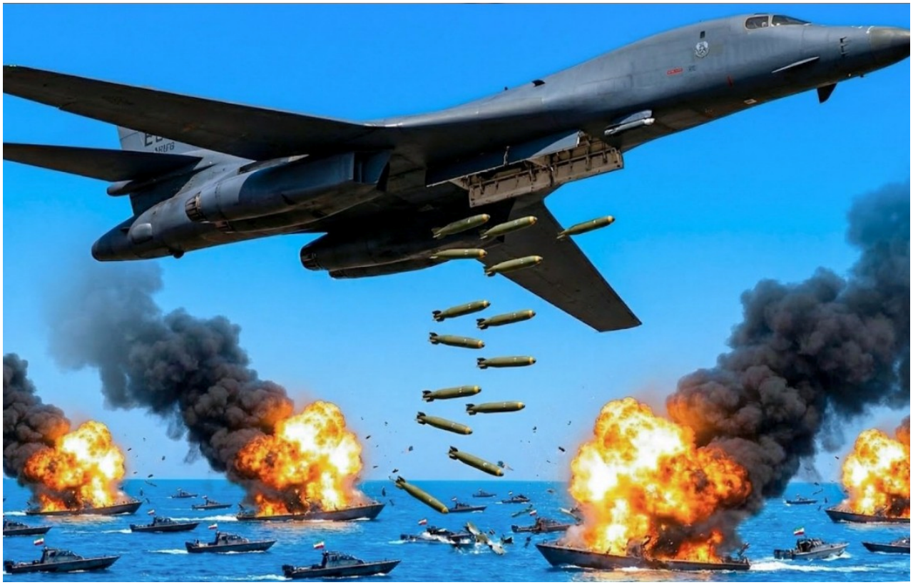 The U.S. response was swift, overwhelming, and merciless. As the Iranian flotilla closed in, B-1B Lancer bombers thundered overhead and unleashed a jaw-dropping barrage of 6,720 precision-guided smart bombs in one of the most intense aerial ᴀssaults of the 2026 conflict. The sky lit up as wave after wave of munitions rained down with terrifying accuracy. Explosions tore through the Iranian boats in rapid succession, turning the sea into a blazing inferno. Within minutes, the vast majority of the 150-vessel armada was destroyed or sinking.