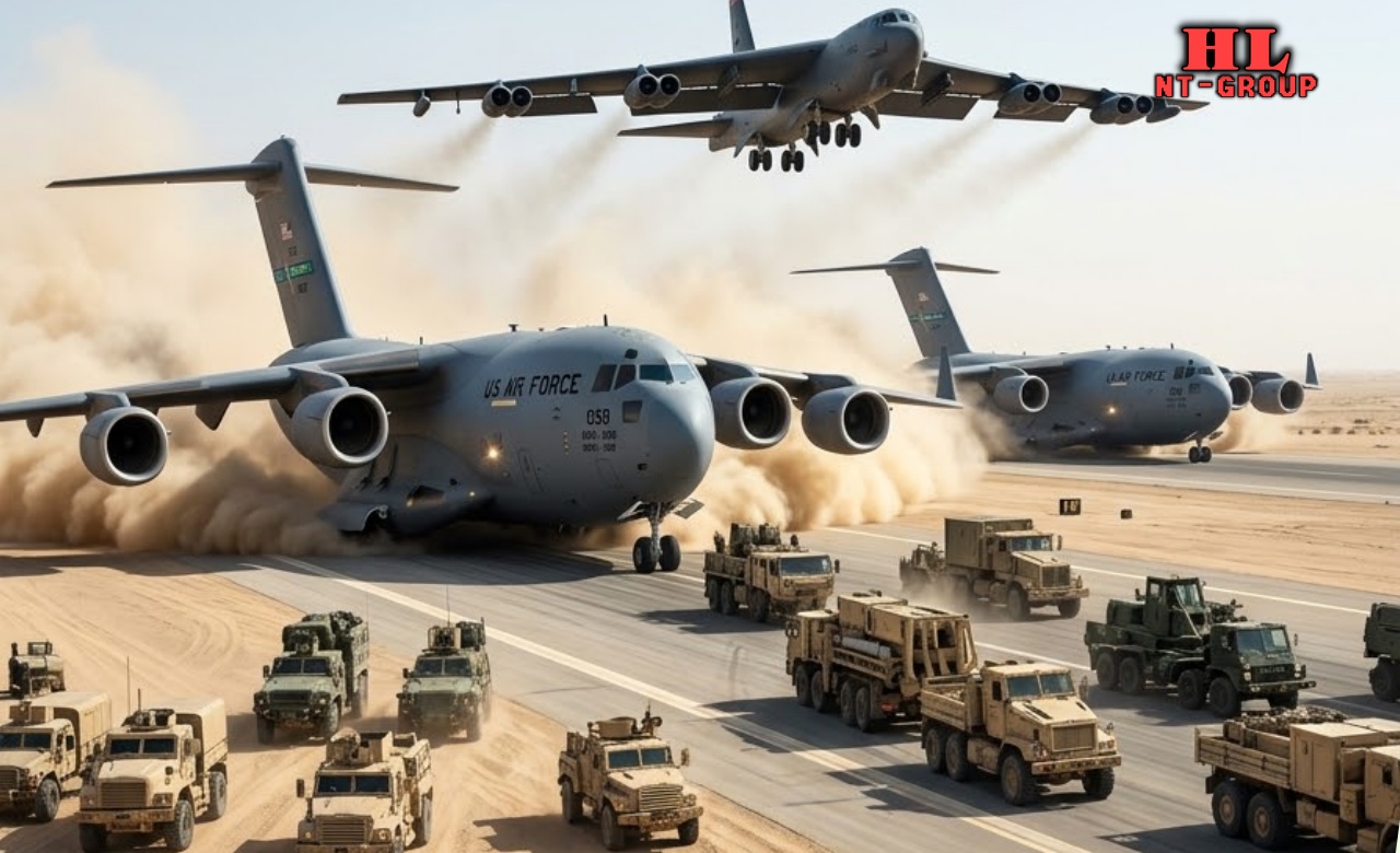 Dozens of giant C-17 Globemaster III transport aircraft, escorted by B-52 strategic bombers, have been landing continuously at forward bases in the Gulf, offloading thousands of Marines, Army infantry units, armored vehicles, and heavy artillery. The scale of the airlift is one of the largest in recent U.S. military history.