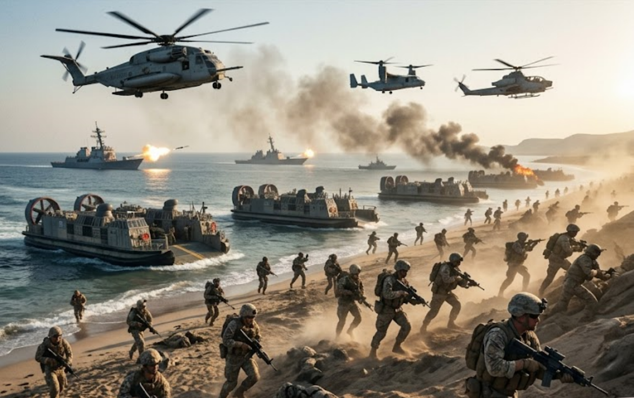 Operating with overwhelming firepower and precision, American troops stormed key coastal positions while Marine amphibious units struck from the sea. Supported by AH-64 Apache helicopters and naval gunfire, the joint force destroyed dozens of Iranian vessels and neutralized multiple missile launch sites within hours. Explosions lit up the coastline as Iranian attempts to block the strait were systematically crushed.