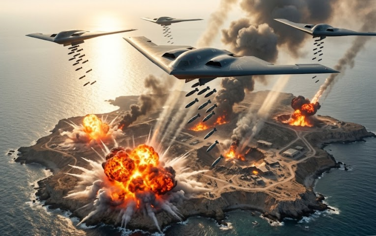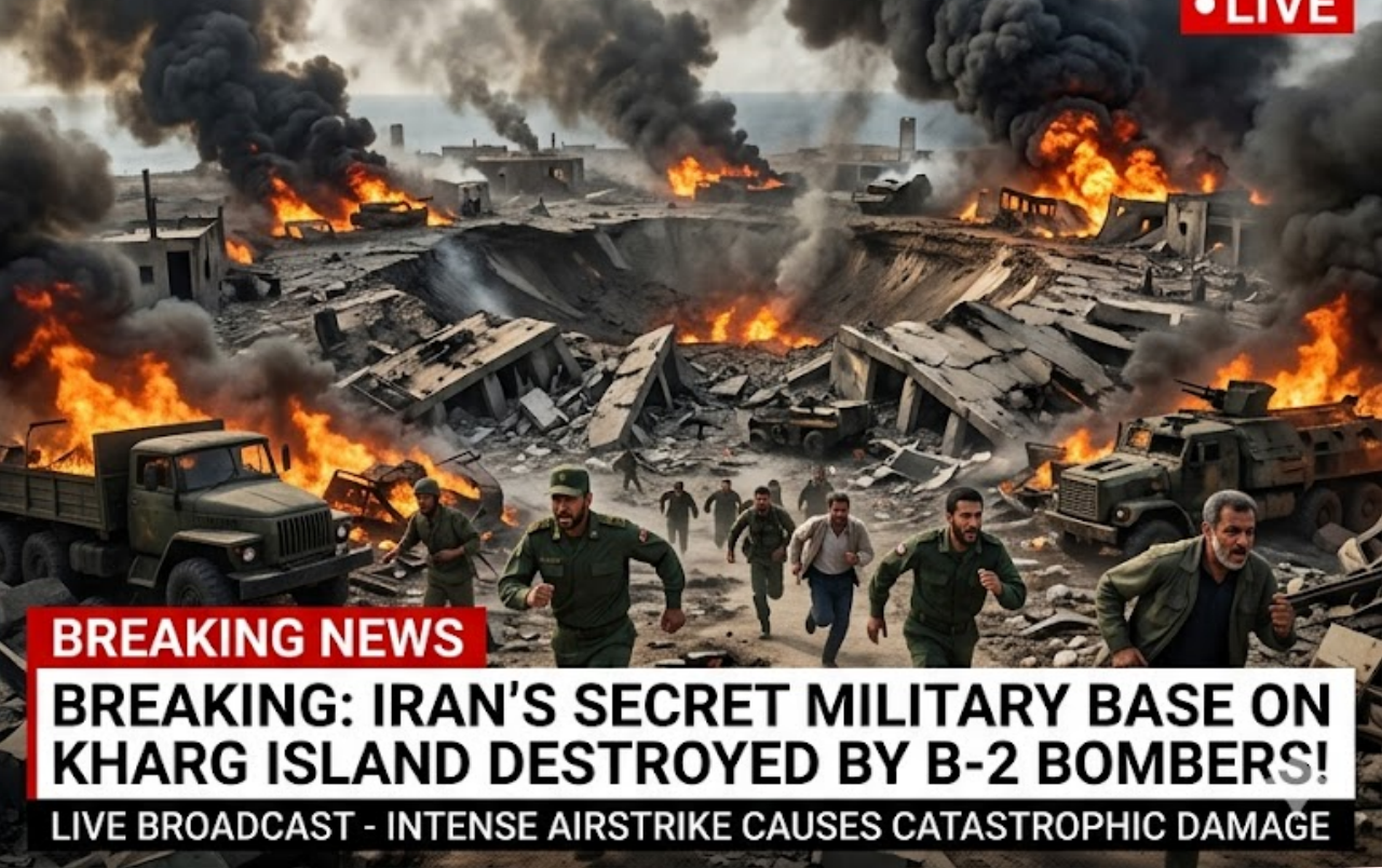 In a devastating precision strike that just occurred, U.S. and Israeli B-2 Spirit stealth bombers have completely destroyed Iran’s secret military base on Kharg Island — the regime’s most critical strategic outpost in the Persian Gulf.