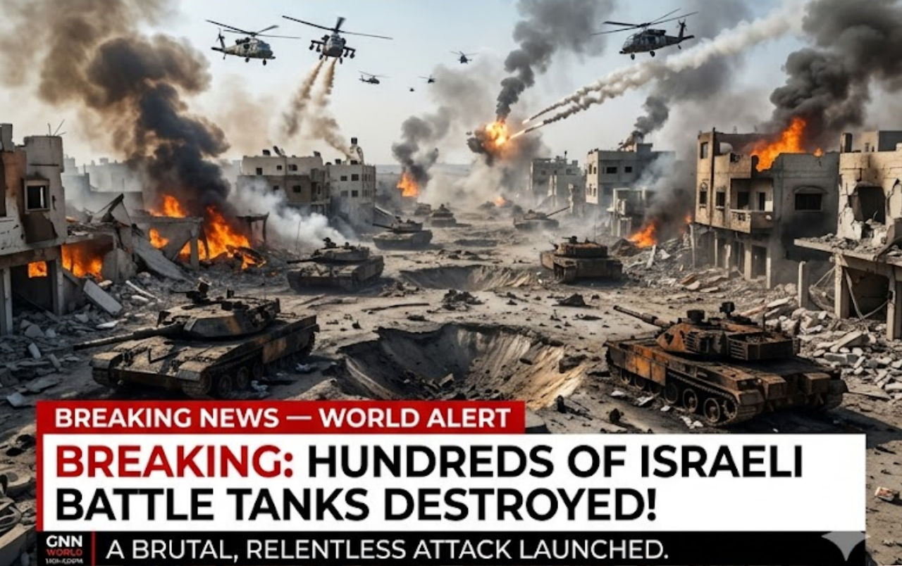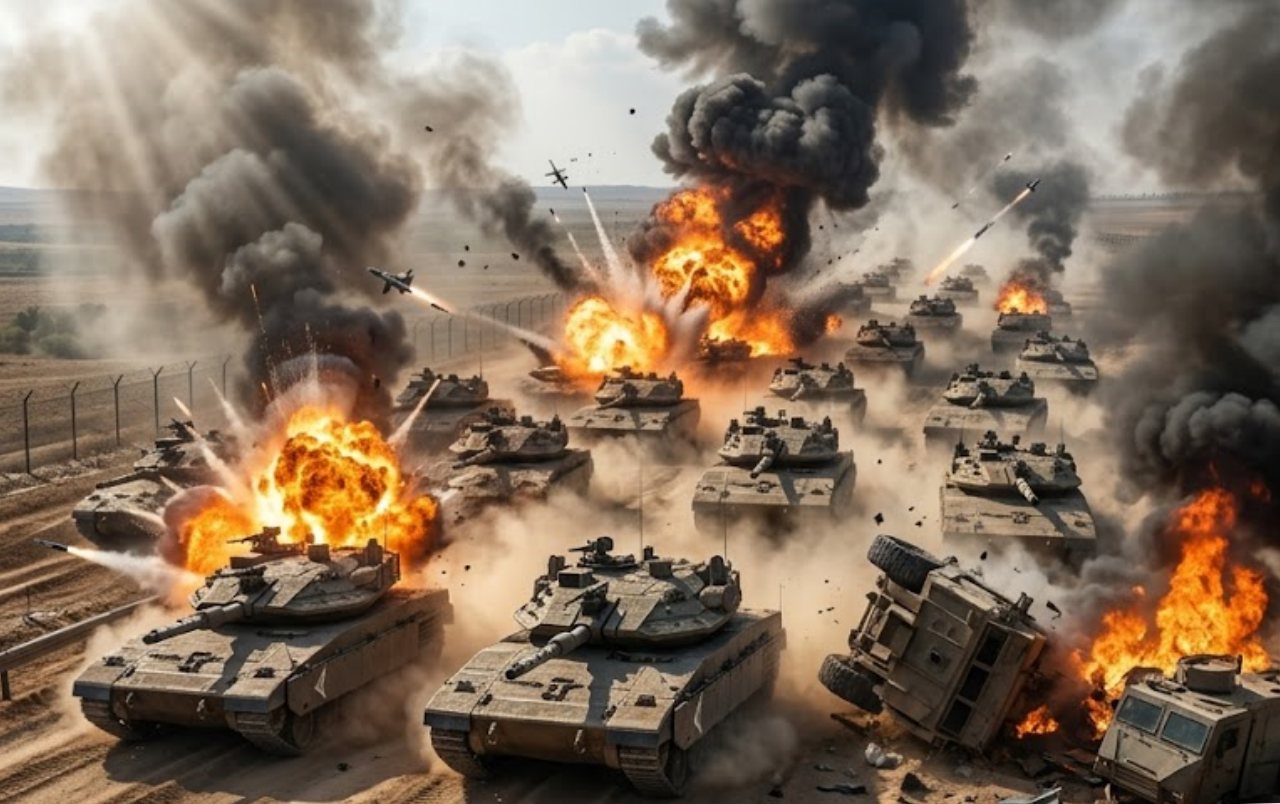 According to battlefield reports and footage released by Iranian and Hezbollah sources, over 300 drones — including explosive suicide models and loitering munitions — descended in coordinated waves on IDF positions in Jiutian. The swarm overwhelmed local air defenses, with dozens of precision strikes slamming into Merkava tanks, armored personnel carriers, and engineering vehicles. Thick columns of smoke rose from the burning wreckage as secondary explosions tore through the convoy. Iranian officials claim at least 60 IDF armored vehicles were either destroyed or heavily damaged in the attack.