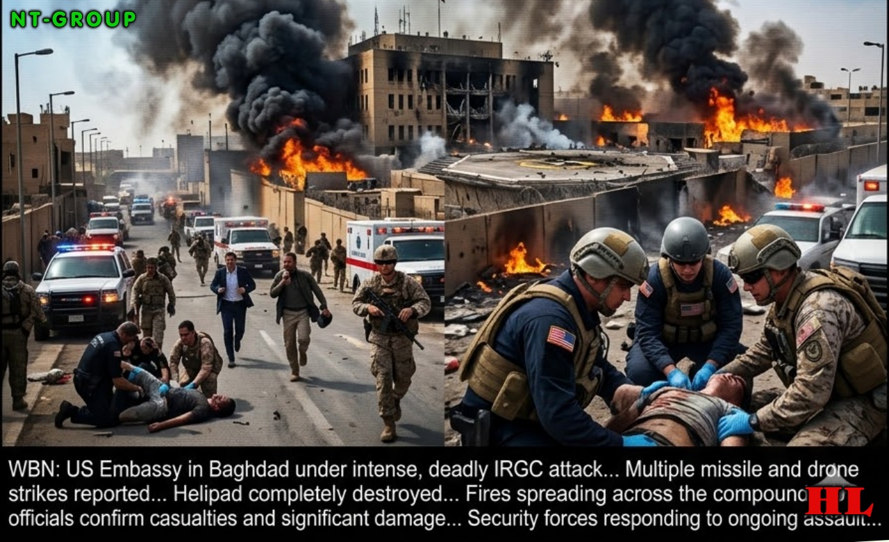 Multiple powerful explosions rocked the embᴀssy compound late Thursday night. A direct hit destroyed the embᴀssy’s main helipad, while another missile struck the main building, triggering raging fires that lit up the Baghdad skyline. Thick black smoke poured from the complex as emergency teams battled the blaze. Reports confirm several casualties among U.S. security personnel and contractors.