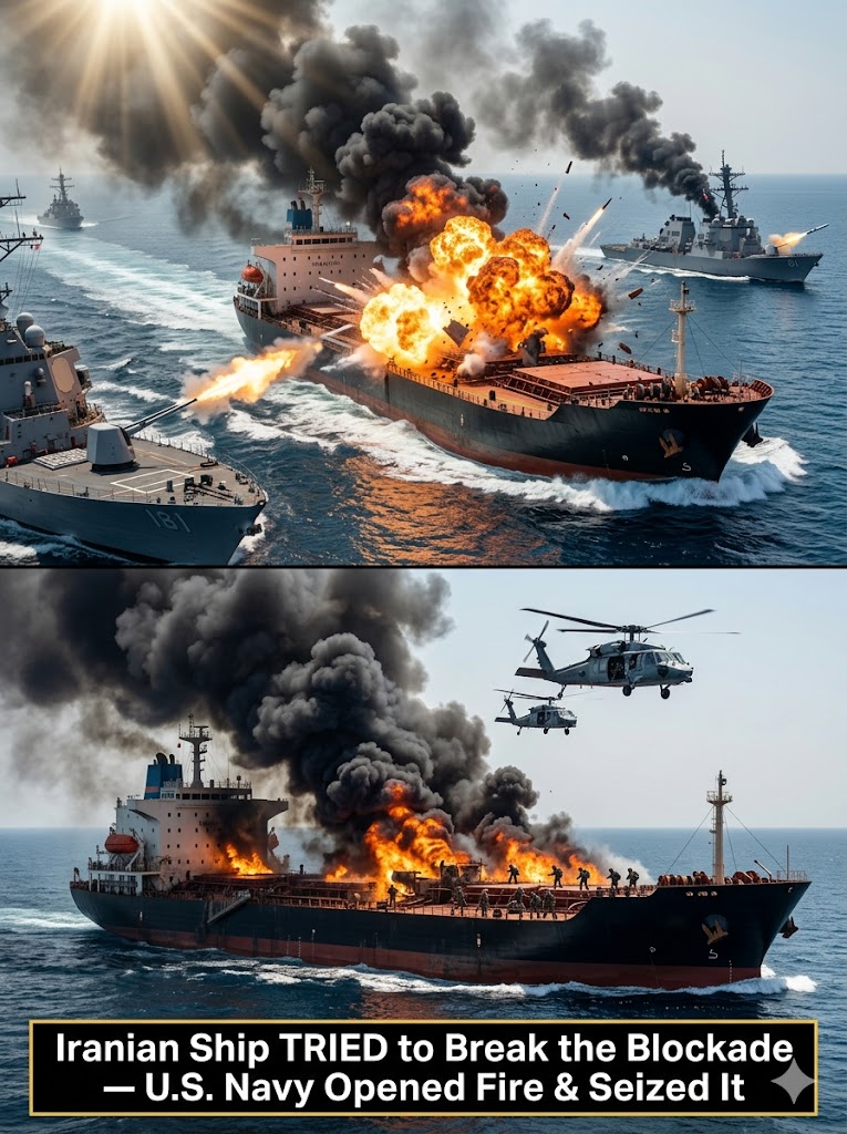In a tense and dramatic confrontation in the Strait of Hormuz this morning, a defiant Iranian cargo vessel attempted to smash through President Trump’s ironclad naval blockade — only to be met with overwhelming American firepower. The U.S. Navy issued clear warnings, then opened fire with precision sH๏τs across the bow and superstructure, forcing the ship to halt. Elite boarding teams swiftly seized the vessel, raising the American flag over Iranian defiance.