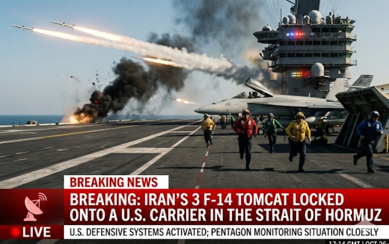 In a bold but suicidal move, three Iranian F-14 Tomcat fighter jets emerged from low-alтιтude flight and locked their radar onto the USS Abraham Lincoln carrier strike group operating in the Strait of Hormuz just minutes ago.