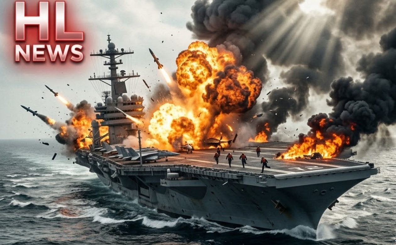Iranian military sources confirm that advanced Qader cruise missiles launched from coastal positions successfully penetrated the carrier strike group’s layered defenses. Multiple impacts caused significant fires on the flight deck and damaged key radar and propulsion systems. Dramatic footage released by Iranian media shows bright streaks racing across the sea followed by powerful explosions on the carrier’s superstructure. Thick black smoke was seen rising from the vessel as damage control teams scrambled to contain the blazes.