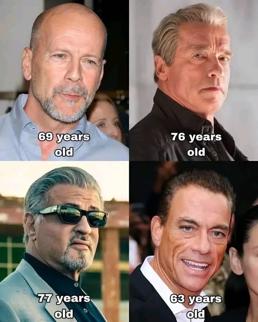 This striking image brings together four iconic action stars at different stages of their later years, each labeled with their age: 63, 69, 76, and 77. What stands out immediately is not just the number, but how each of them continues to project strength, confidence, and star power despite the pᴀssing decades.