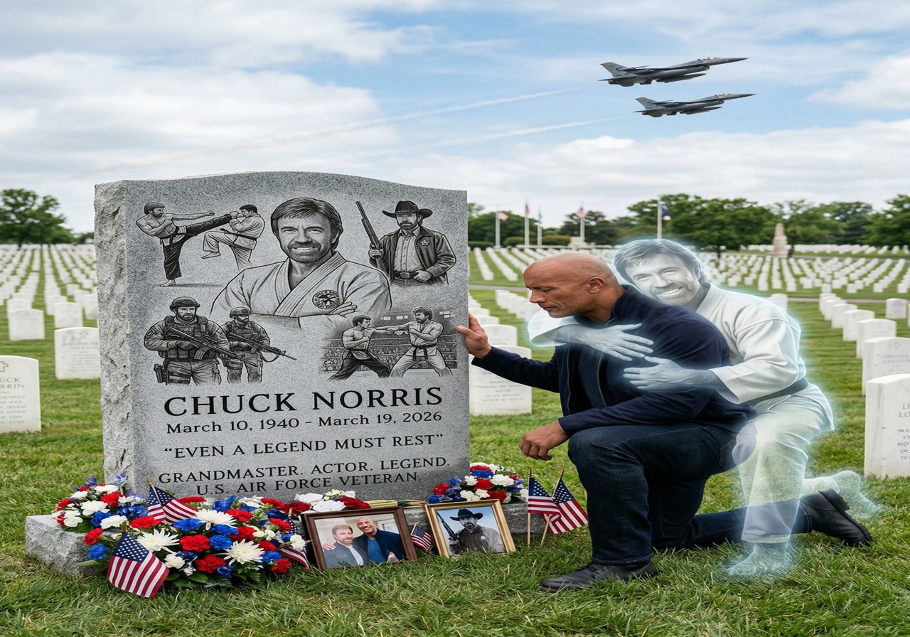 In a quiet field where rows of white headstones stretch endlessly beneath a vast and peaceful sky, a powerful moment of remembrance unfolds. The air feels still, almost sacred, as if time itself pauses to honor the memory of a legend. Kneeling before the grave of Chuck Norris is Dwayne Johnson—a modern icon of strength and charisma, now humbled in the presence of a man who defined what it truly meant to be strong.