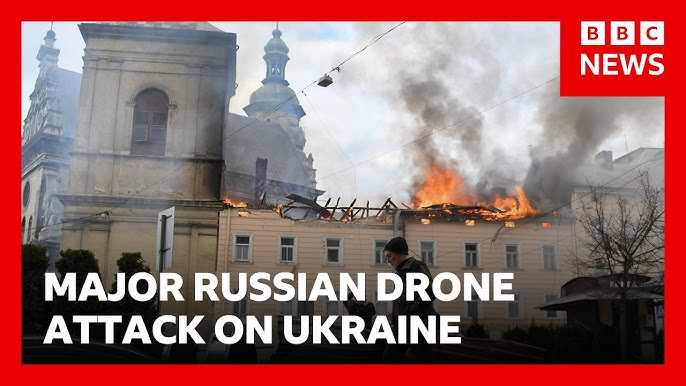 A rare Russian daytime drone attack on Ukraine has killed at least three people, wounded 30 and set a building in the centuries-old centre of western Lviv aflame, officials have said, following an overnight bombardment that killed five people across the country.