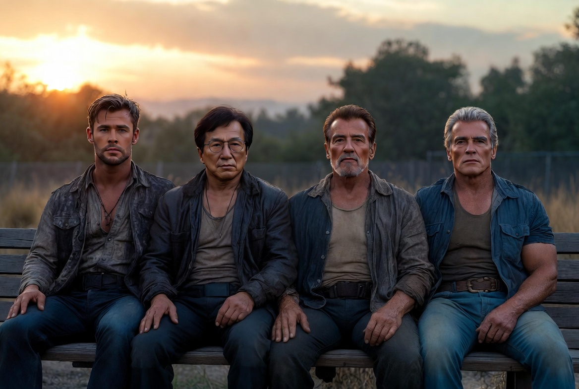 Sylvester Stallone as the young, battle-hardened Rambo sits shoulder to shoulder with his older, wiser self. Beside him, Arnold Schwarzenegger — once the unstoppable force of the 80s — sits quietly next to the man he has become. Jackie Chan, the martial arts icon who laughed through pain and danger, appears both in his fearless youth and his seasoned grace. And completing the circle is Chris Hemsworth, the new generation’s torchbearer, sitting among the giants who paved the way for him.