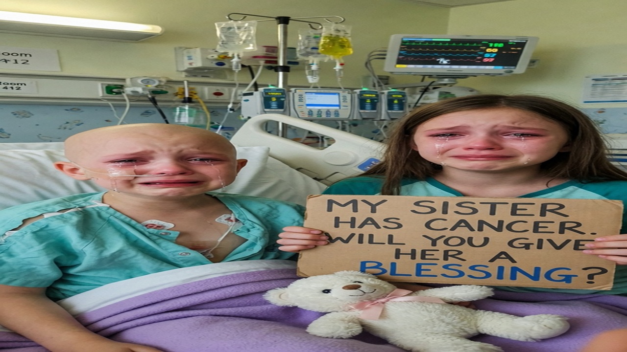 In a cold hospital room, two sisters sat close together, tears streaming down their faces. The younger sister, her head bald from chemotherapy, an oxygen tube still attached to her face, her eyes red and swollen from sobbing. Beside her was her older sister, also unable to hold back her tears, her hands trembling as she held a cardboard sign with bold lettering: