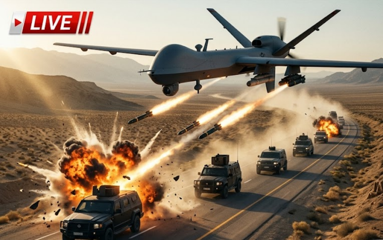 Just hours ago, the Reaper — equipped with next-generation sensors, extended endurance, and upgraded precision munitions — located the heavily armored convoy racing out of the capital toward the northeast. After positive identification, the drone unleashed a devastating barrage of Hellfire missiles, obliterating multiple vehicles in the convoy in seconds. The strike left the road littered with burning wreckage and confirmed the elimination of a key figure in Iran’s crumbling military leadership.