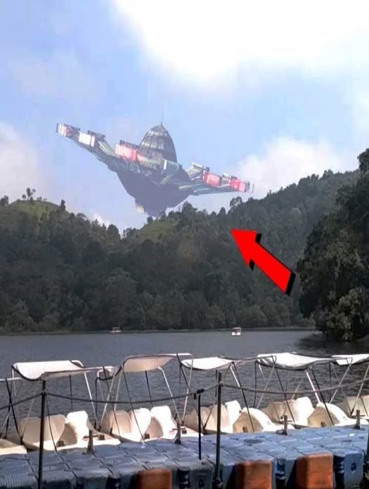 In the spring of 1983, along a quiet lakeside bordered by dense forested hills, witnesses reported an object so large it seemed to eclipse the skyline itself. The image ᴀssociated with the event—showing a mᴀssive, angular craft hovering just above a tree-covered ridge—quickly became the centerpiece of local legend. Unlike the classic disc-shaped sightings of the 1950s, this structure appears architectural, industrial, almost modular. Its extended lateral sections glow faintly with red illumination, suggesting controlled energy distribution rather than combustion. No visible exhaust trails. No rotor wash disturbing the treetops. The scale alone challenges conventional aerospace engineering of that era. In 1983, stealth aircraft were still experimental, and no publicly known craft approached such size or hovering capability. Within a speculative science-fiction framework, the object resembles not a scout—but a survey vessel, positioned deliberately over a geographical feature rich in water and biodiversity.
