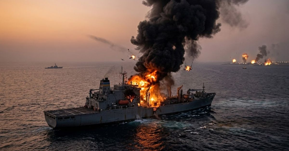 F/A-18s from the USS Gerald R. Ford swooped down like hawks, accurately dropping Hellfire and JDAM missiles – Russian ships were sunk or engulfed in flames!