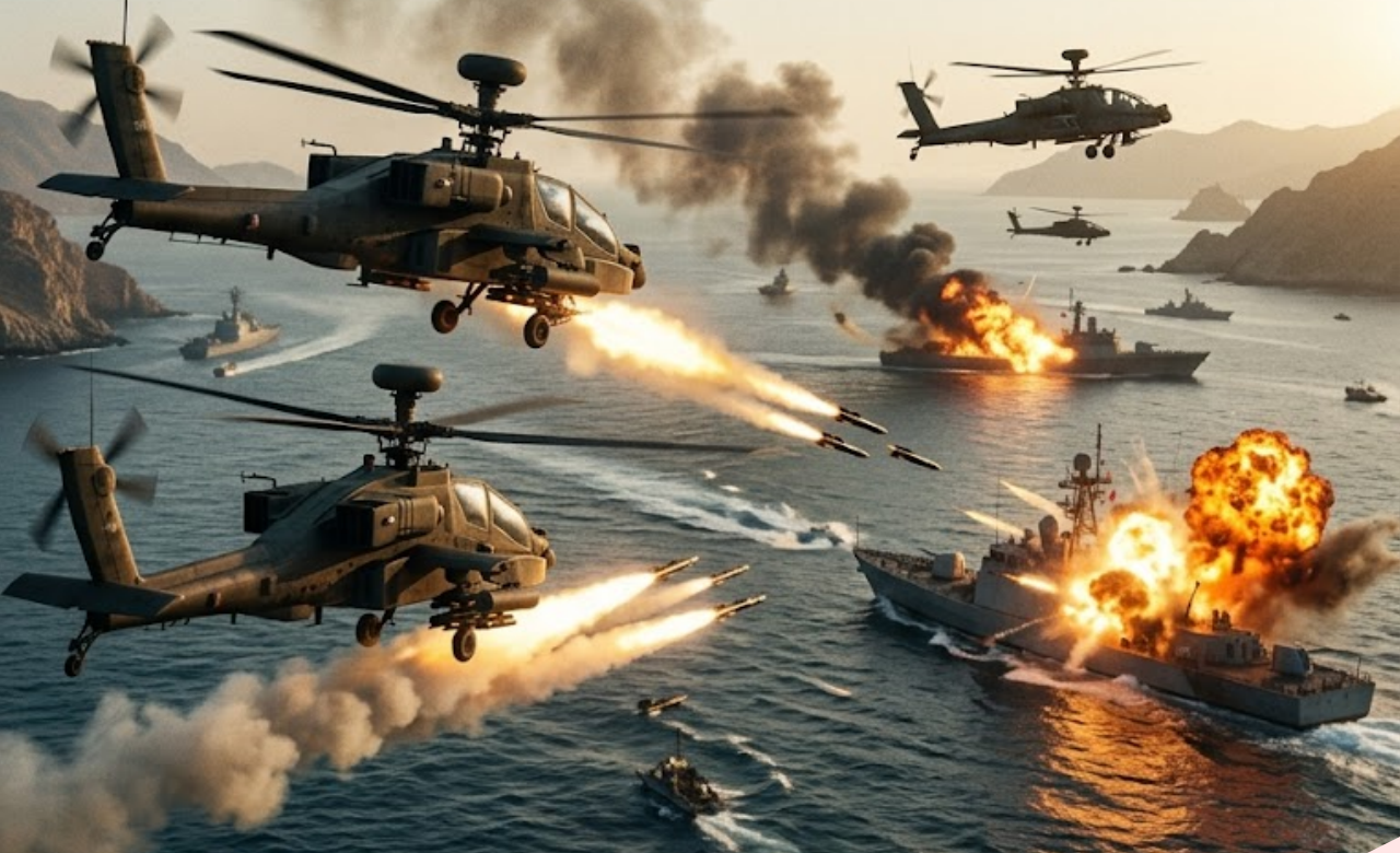 Low-flying and heavily armed with Hellfire missiles and 30mm chain guns, the Apaches have turned the once-contested strait into a lethal kill zone for Iranian forces. Multiple burning wrecks now litter the waters as thick black smoke rises from destroyed coastal positions. International oil tankers have already begun moving safely again under the protection of American air power.