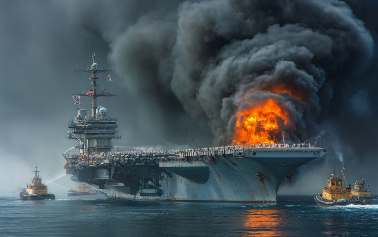 The attack occurred as the carrier was operating in support of coalition forces in the Middle East. Russian Su-35 pilots exploited a temporary gap in air coverage, launching a barrage of high-speed anti-ship missiles that penetrated the carrier’s defenses. Multiple direct hits caused uncontrollable fires and flooding, forcing the crew to abandon ship as the mᴀssive vessel went down.